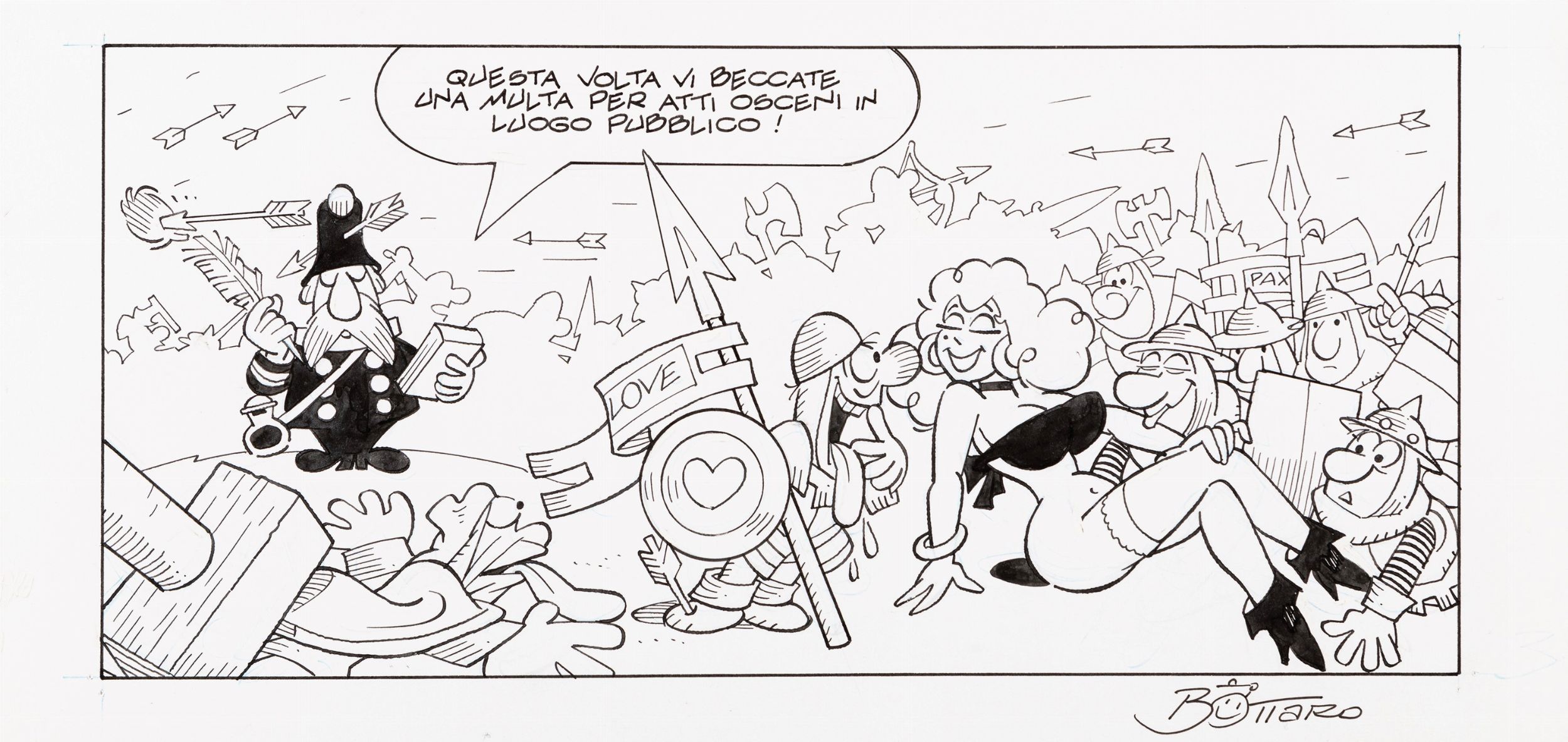 matita e china su cartoncino, 35 x 17 cm anni '70 Illustrazione originale realizzata da Bottaro per il celebre ciclo delle sue Mattaglie, quelle Matte Battaglie, affollatissime quanto irreali istantanee comico-guerresche, che più di ogni altro suo lavoro hanno reso celebre Bottaro a livello internazionale. Firmata.
