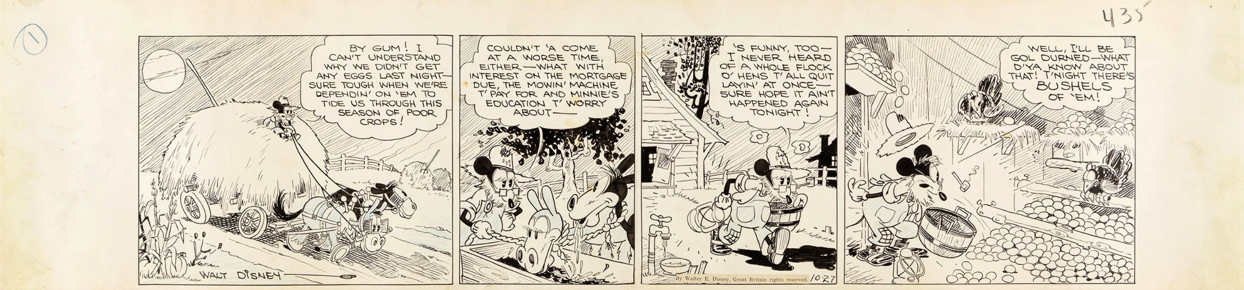 27/10/1930 Striscia giornaliera del 27/10/1930 per Mickey Mouse. Quella da noi presentata è la seconda striscia più antica mai apparsa sul mercato di Mickey Mouse, appartiene al terzo arco narrativo intitolato Mr. Slicker and the Egg Robbers (tradotto in italiano Topolino e il bel gagà) ed il primo che vide Gottfredson sia ai disegni che ai testi. Protagonista di questa storica giornaliera è Marcus Mouse, il padre di Minnie, sconsolato ed alla guida di un carro di fieno mentre si preoccupa per le finanze della sua famiglia a causa dell'apparente scarsità di uova deposte dalle sue galline. Di grande fascino l'ambientazione rurale (tipica dei primissimi anni della serie), la futura Topolinia è formata da poche case di campagna e l'atmosfera è costantemente in bilico tra momenti infantili alla Silly Synphonies, come quando Topolino gioca con gli animali delle fattorie, e scene neorealiste dove appaiono tutti i problemi quotidiani della Grande Depressione. Un'opera da museo. Fori di affissione agli angoli superiori, la striscia è stata arrotolata e quindi risulta leggermente inarcata. Firmata Walt Disney e datata.