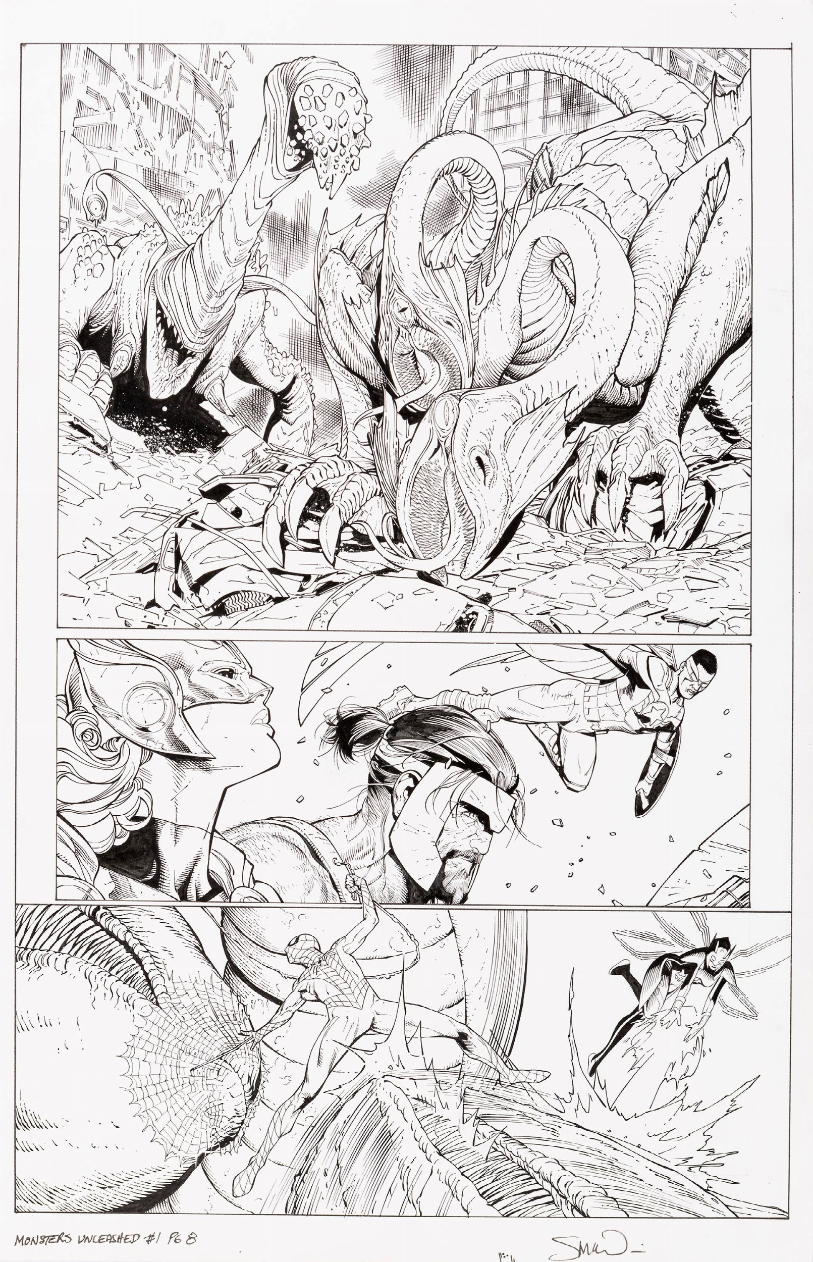2017 Tavola originale realizzata da McNiven per la miniserie Monsters Unleashed n. 1, edita a pag. 8 dalla Marvel nel 2017. Firmata.