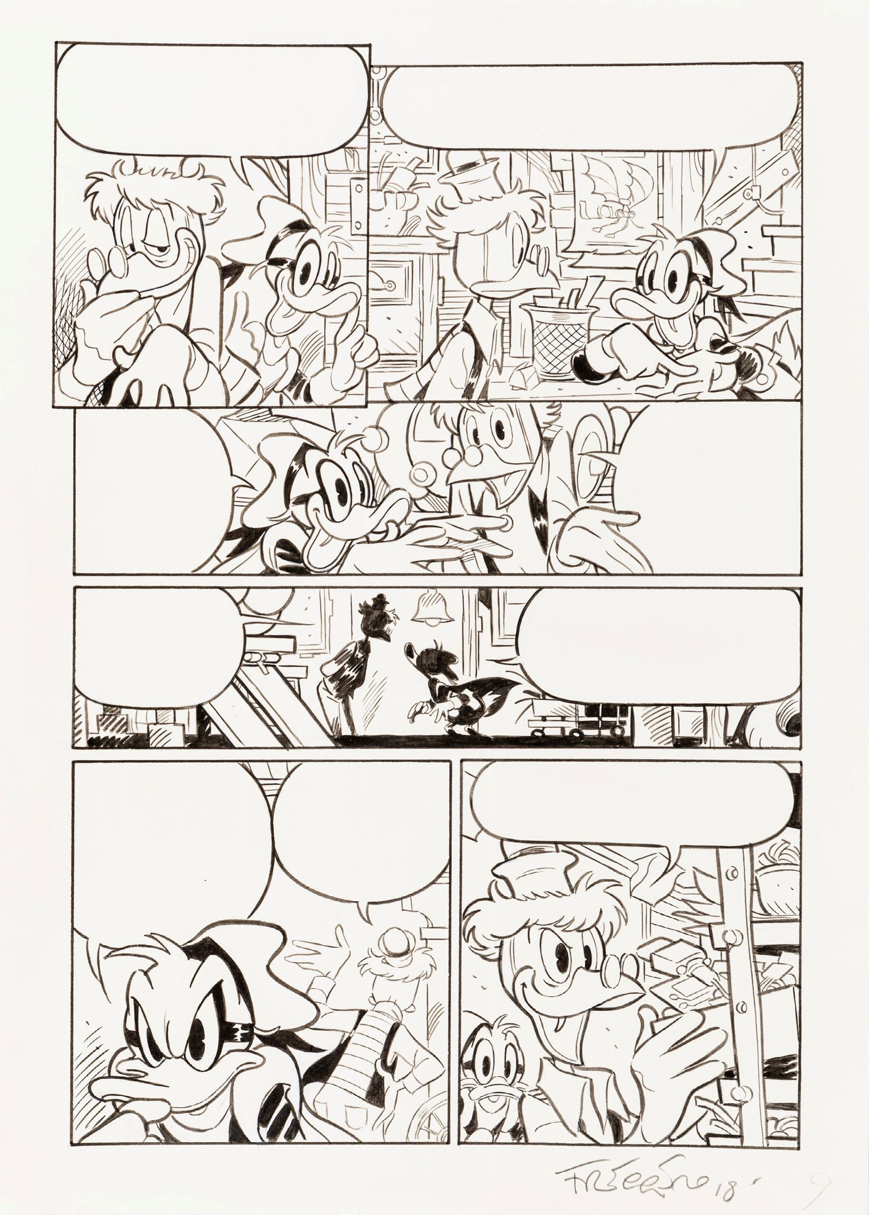 2018 Tavola originale realizzata da Freccero per Paperinik e il raggio sfortunatore, edita in Italia su Paperinik n. 27 a pag. 9 nel 2019. Firmata e datata.