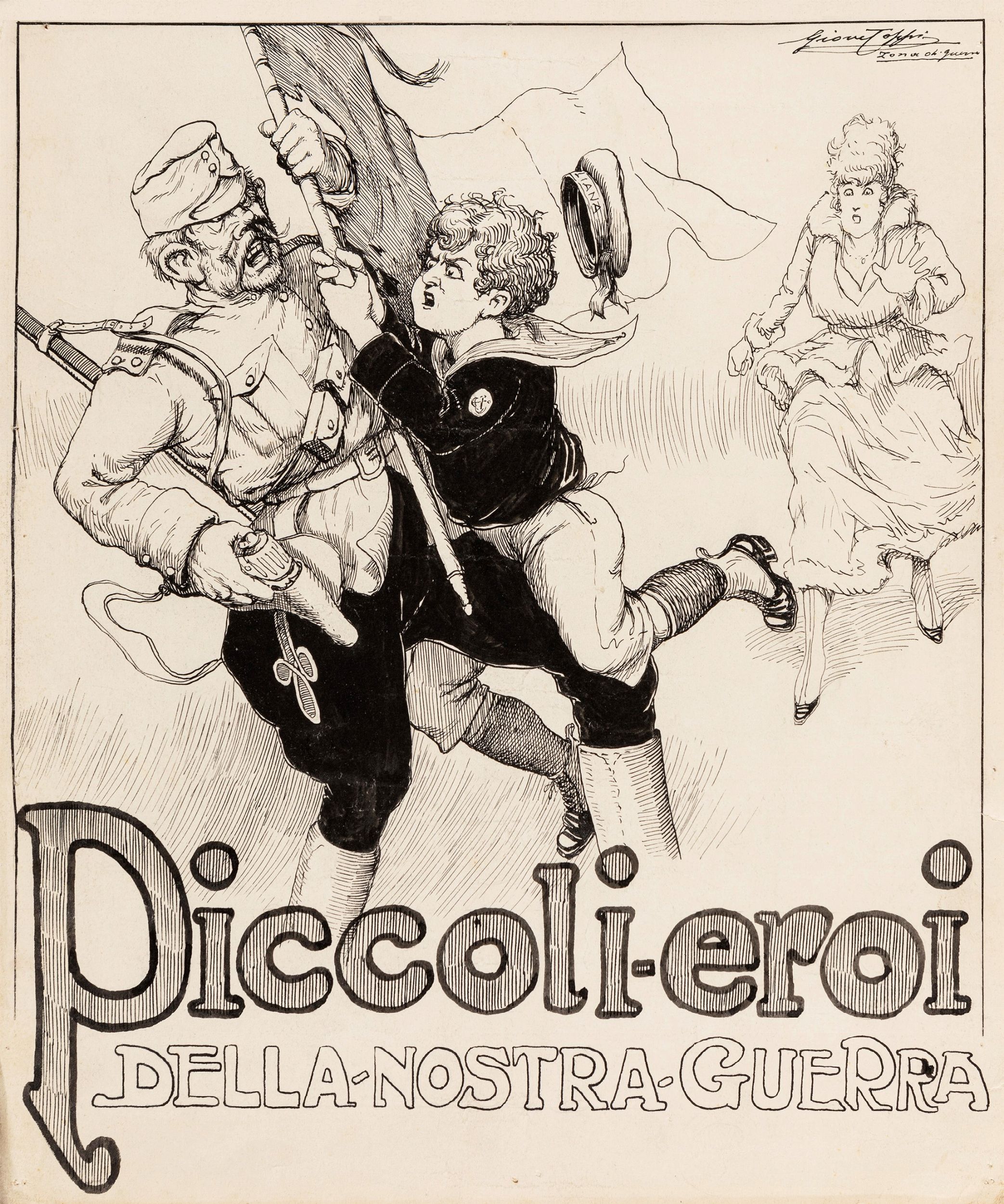 matita e china su cartoncino, 25 x 32,5 cm 1918 Originale di copertina realizzato da Toppi durante il suo servizio militare (dicitura in zona di guerra) per Piccoli eroi della nostra guerra, edito da Nerbini nel 1918. Lievi pieghe orizzontali. Firmato.