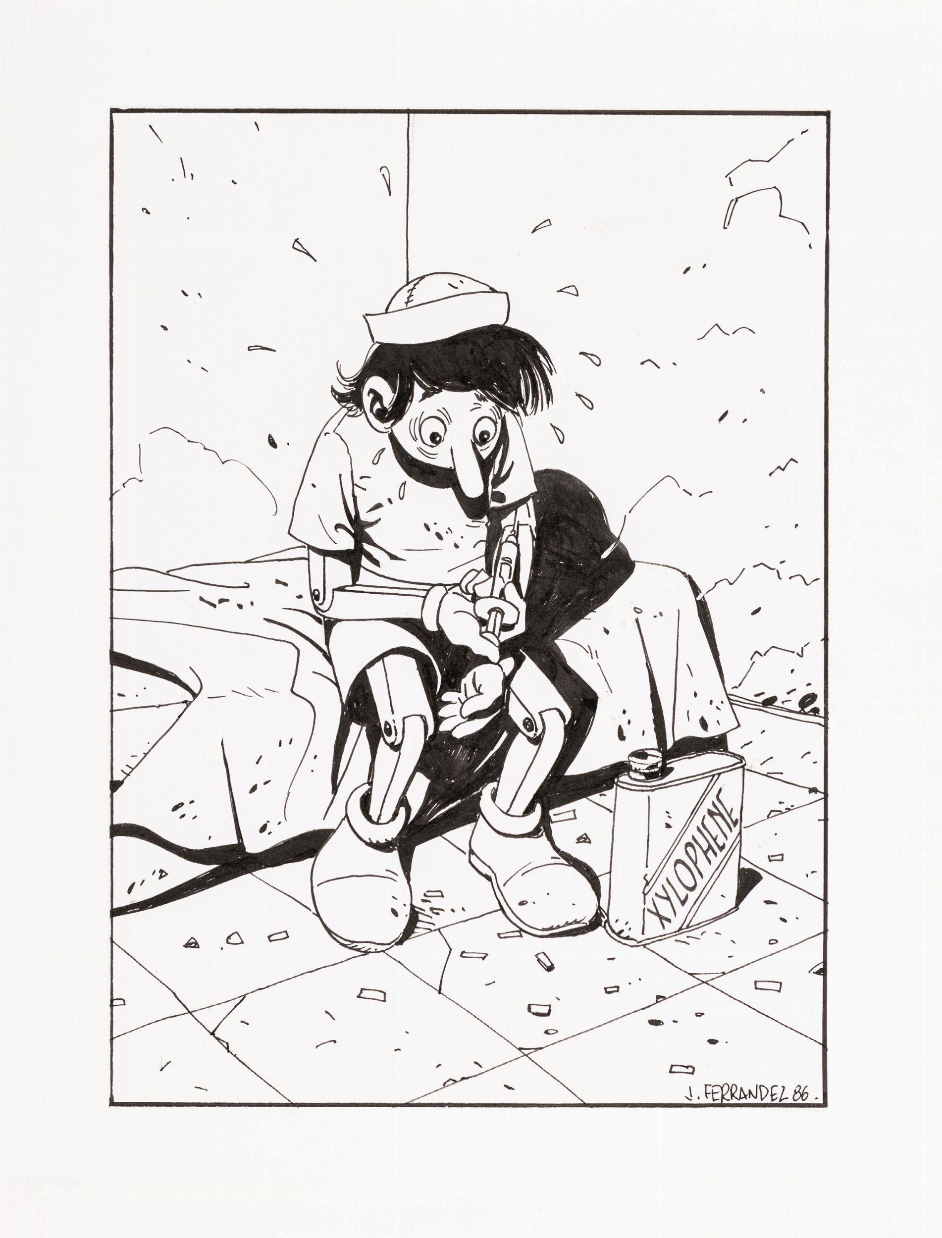 matita e china su carta applicata a cartoncino, 16 x 22 cm 1986 Illustrazione originale realizzata dal francese Ferrandez in occasione della mostra Pinocchio graphis: un naso lungo duecento disegni inediti, tenutasi a Venezia nel 1986, pubblicata sull´omonimo catalogo edito dall´Editrice Montagna nel 1997. Firmata e datata.