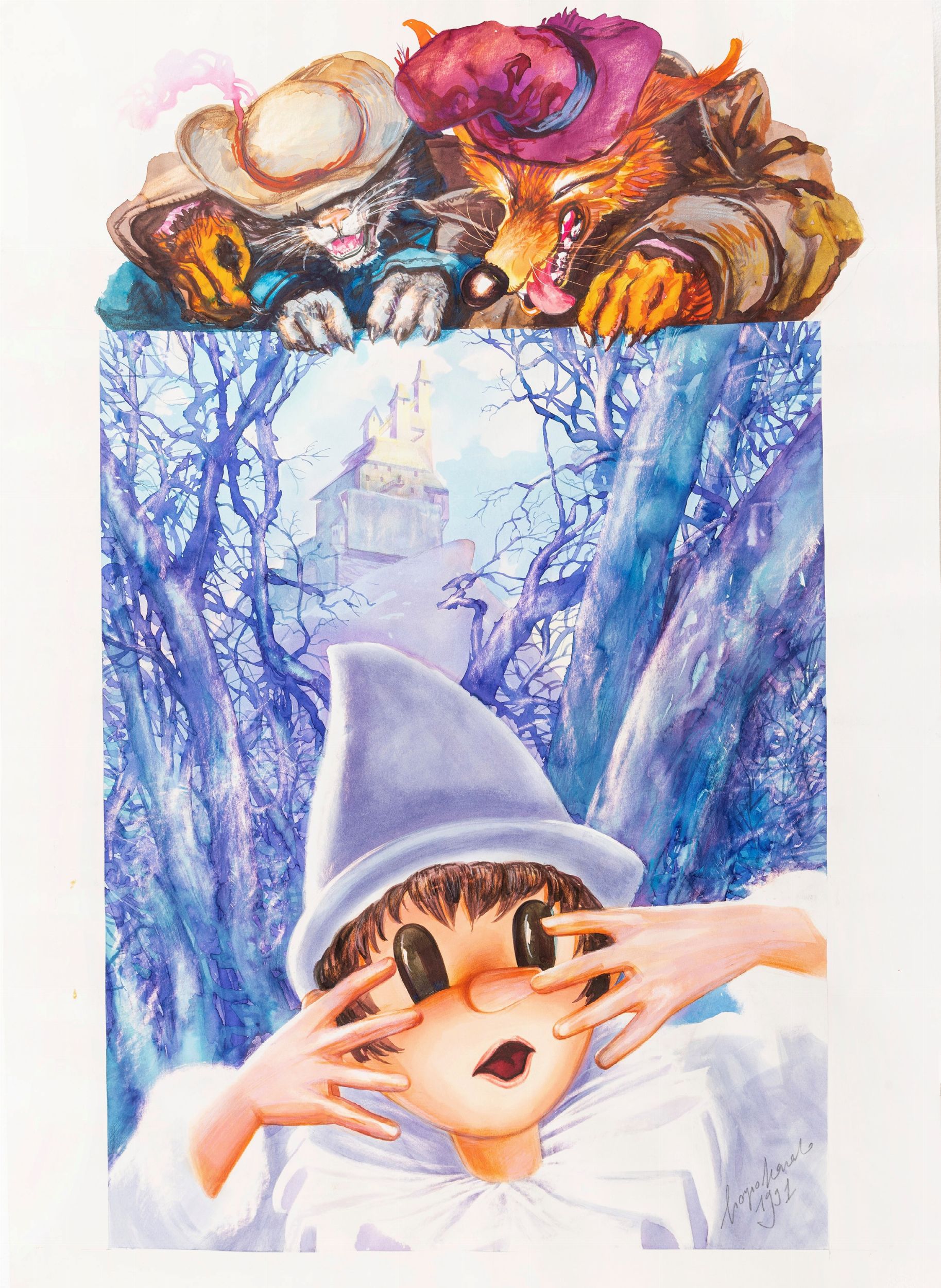acquerello e tempera su cartoncino, 50 x 70 cm 1991 Illustrazione originale realizzata da Scarato in occasione della mostra Pinocchio: un naso lungo...il giro del mondo, tenutasi a Bassano del Grappa nel 1998, pubblicata sull'omonimo catalogo a pag. 45 da Arsenale Editrice. Carta ondulata. Firmata e datata.
