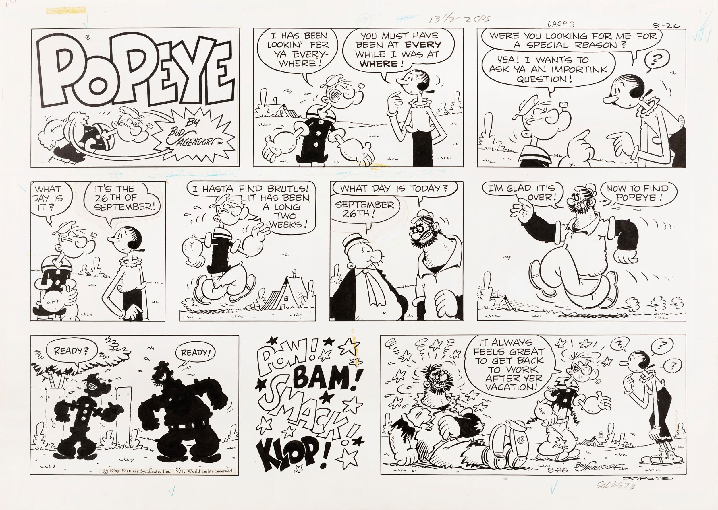 26/09/1971 Tavola domenicale del 26/09/1971 per Popeye. Lieve piega orizzontale al centro. Firmata e datata.