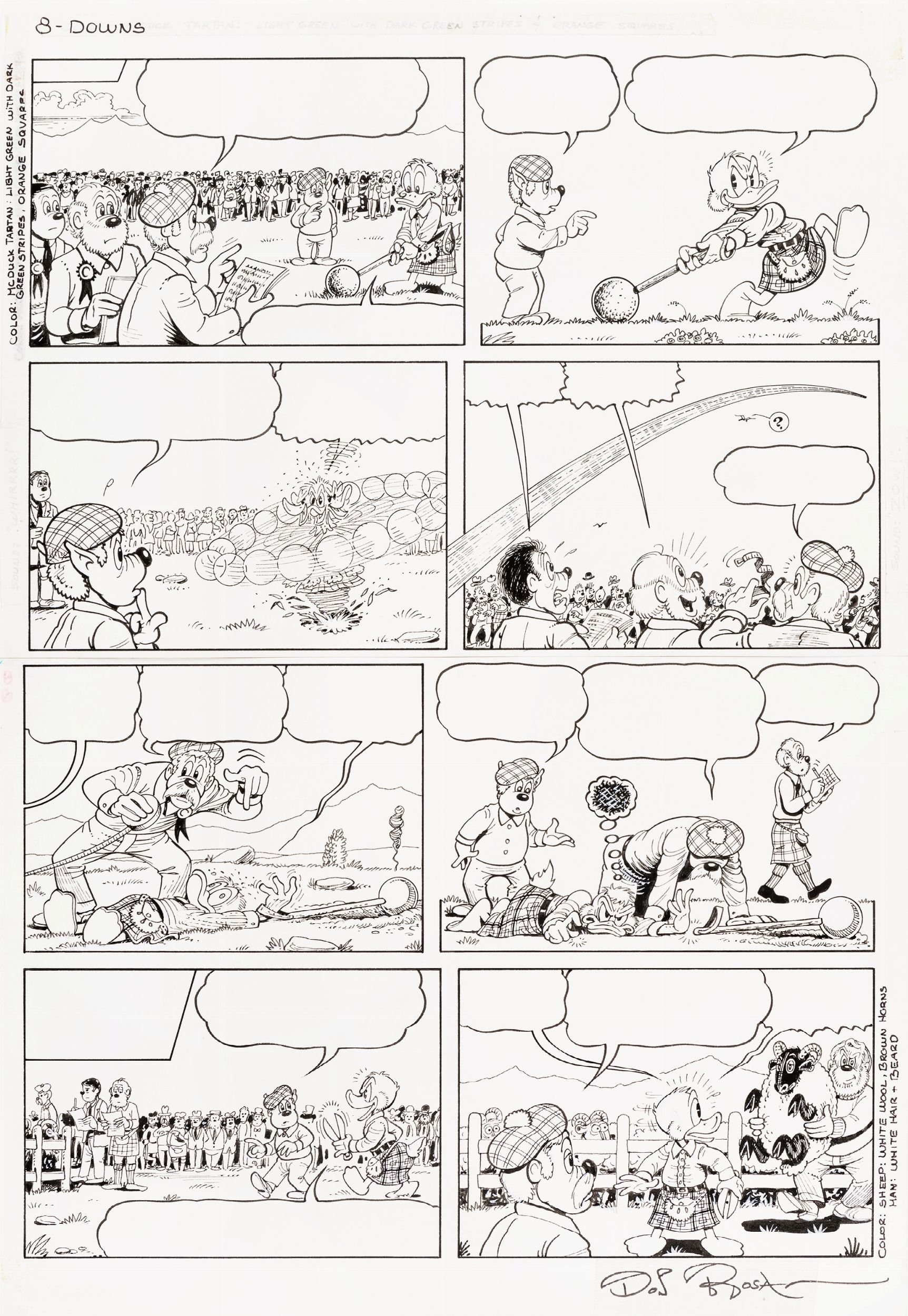 1993 Tavola originale realizzata da Rosa per The Billionaire of Dismal Downs, pagina 8 del nono capitolo della celebra saga The Life and Times of Scrooge McDuck pubblicata per la prima volta in Danimarca nel 1993 e successivamente in Italia con il titolo Il miliardario di Colle Fosco su Zio Paperone n. 78 nel 1996. Nel 1902 Paperone, dopo un periodo di quattro anni in Canada, fa ritorno nella natia Scozia nel villaggio di MacDuich, l'idea è quella di restare per curare i propri affari, è quindi necessario farsi vedere in giro. Incontra, così, il giovane Piva, e Paperone lo incarica di fargli da guida nei Giochi delle Highlands: un festival annuale di sport locali e tradizioni antiche. Paperone si cimenta nelle varie discipline ma la pessima prova fornita lo convincerà a tornare negli in America. Su due pannelli. Firmata.