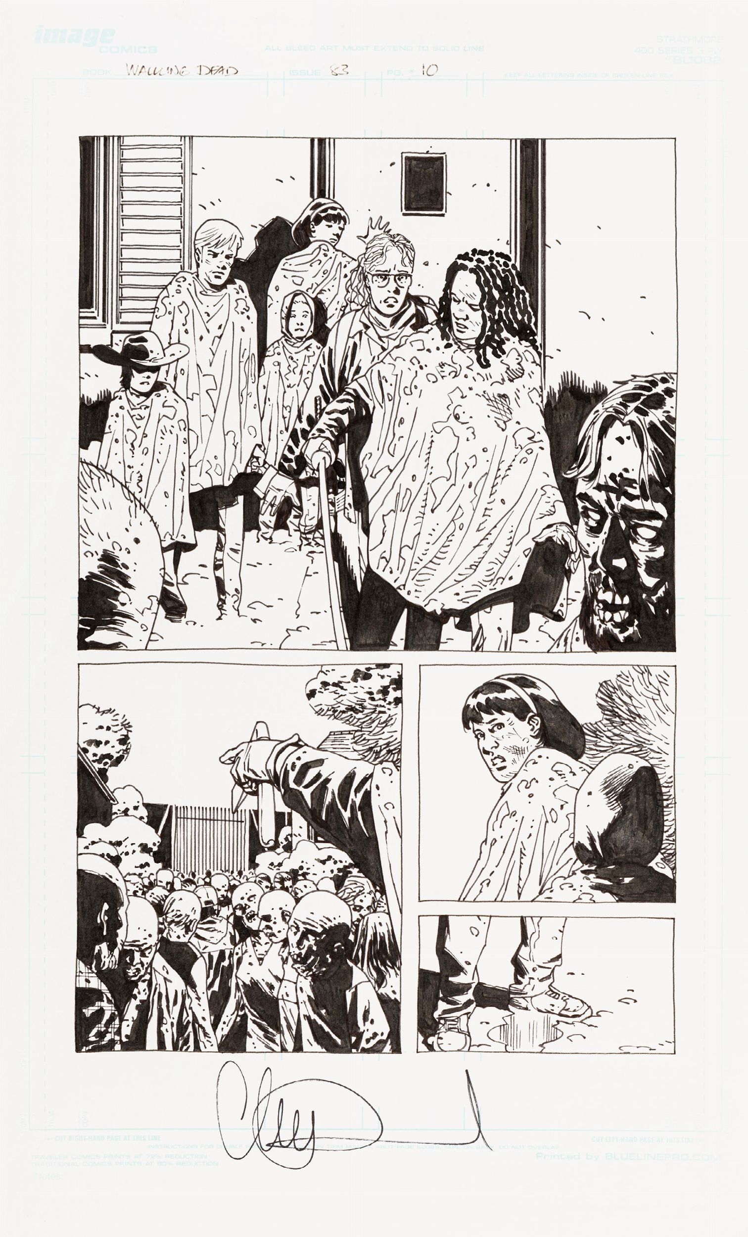matita e china su cartoncino, 21,5 x 35,5 cm 2011 Tavola originale realizzata da Adlard per The Walking Dead n. 83, edita a pag. 10 dalla Image Comics nel 2011. Una pagina perfetta della serie divenuta un cult anche grazie alla fortunata serie TV. Firmata.