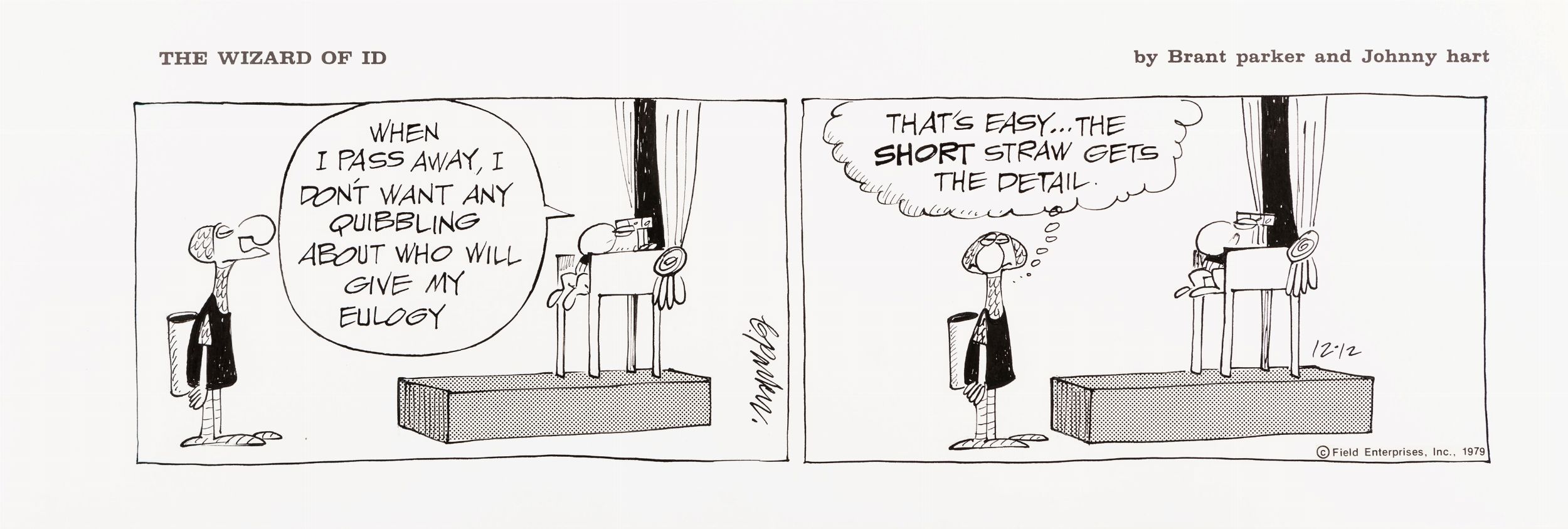 matita, china e retino su cartoncino, 52 x 18 cm 12/12/1979 Striscia giornaliera del 12/12/1979 per The Wizard of Id. Ideata da Johnny Hart (creatore di B.C.), Wizard of ID è ambientata in un castello medievale popolato da personaggi comici e sarcastici con modi di pensare e problemi quotidiani decisamente più da ventesimo secolo che da Medioevo. Firmata e datata.