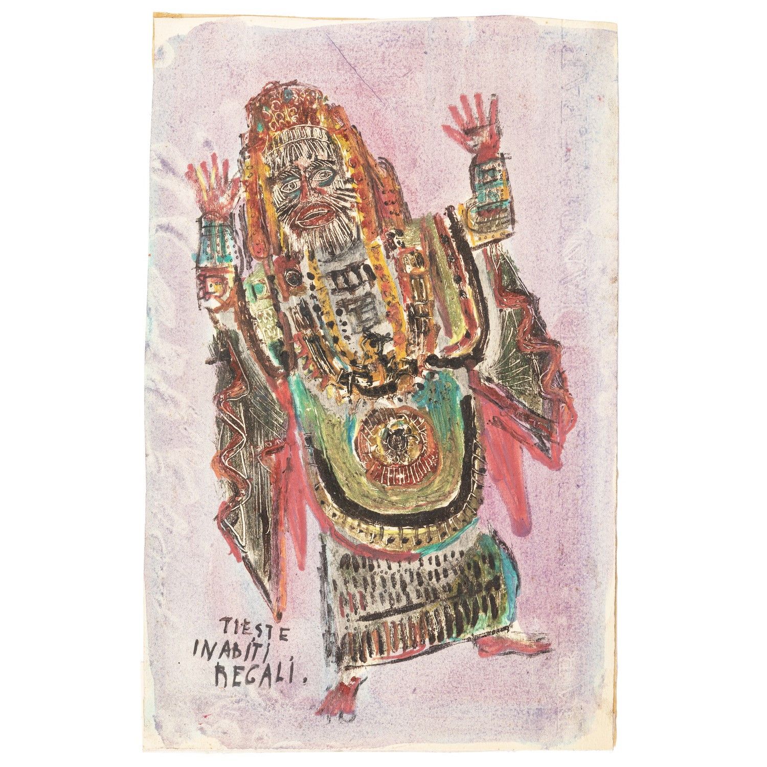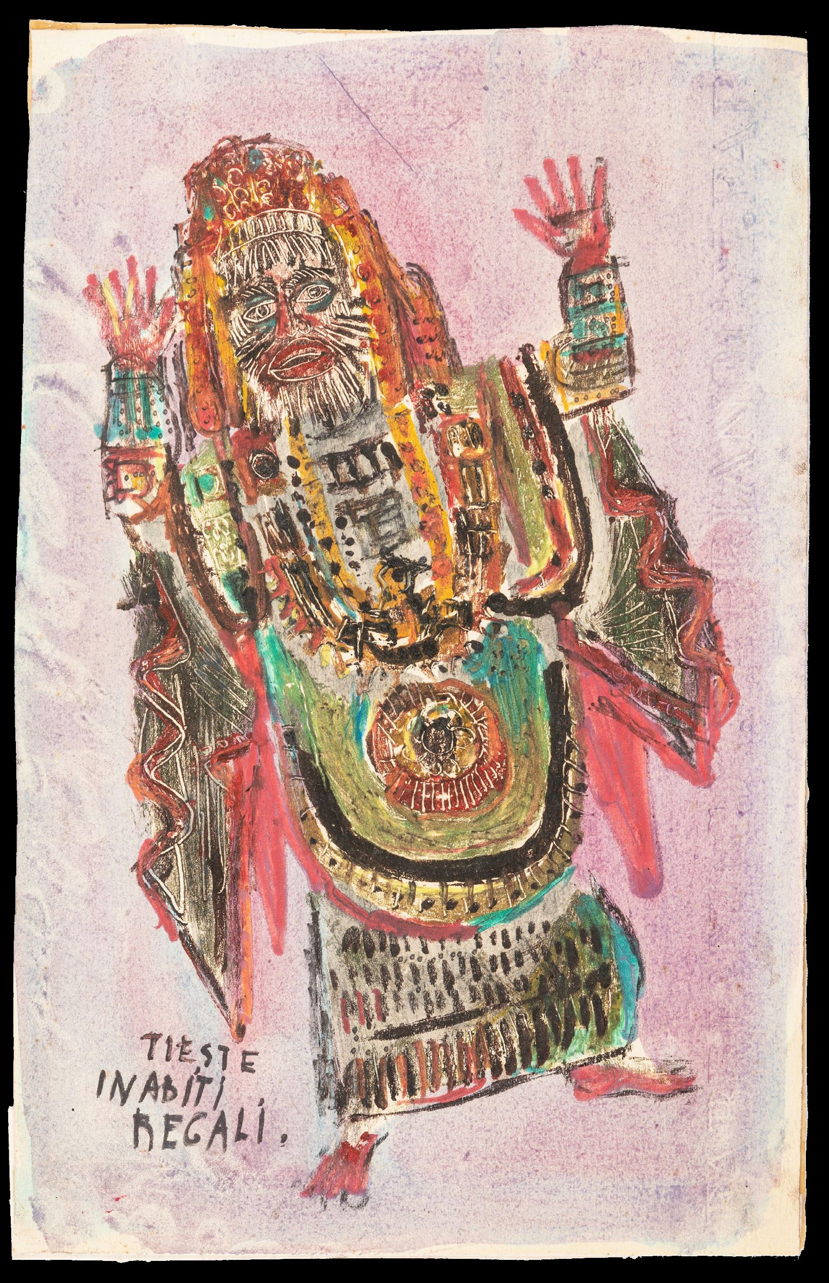 1953 Disegno originale realizzato da Luzzati come figurino teatrale per la rappresentazione dell'opera Tieste di Seneca, messa in scena al Teatro Valle di Roma il 6 Febbraio 1953 con la regia di Vittorio Gassman e Luigi Squarzina. Titolato. (info: http://luigisquarzina.it/wp/italiano/1953/02/06/tieste/)