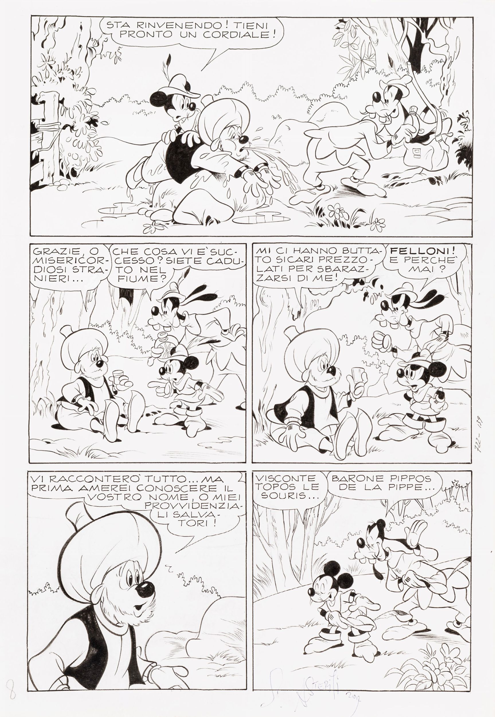 1969 Tavola originale realizzata da Asteriti per Topolino e il magico rubino, edita su Topolino n. 722 a pag. 8 nel Settembre 1969. Celebre parodia Disney ispirata a I tre Moschettieri. Firmata e datata.