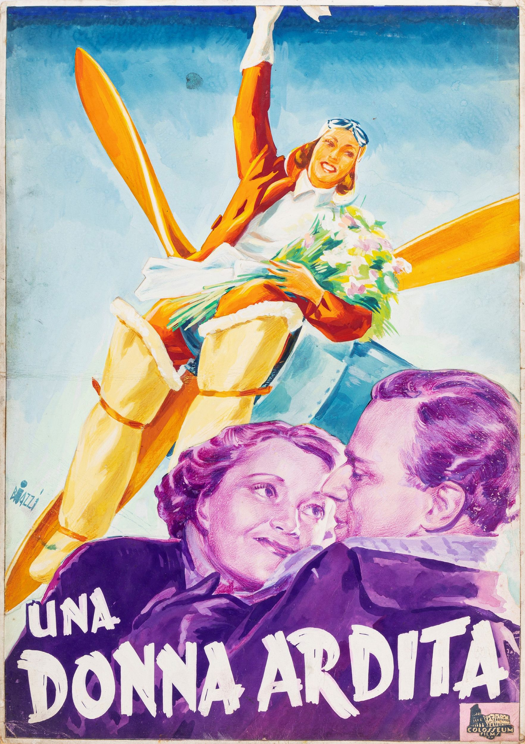 tempera su cartoncino, 36,5 x 52 cm 1936 Bozzetto originale realizzato da Biazzi per la locandina ufficiale del film Una donna ardita, diretto da Raymond Bernard con Annabella, Pierre Richard-Willm e Jean Murat nel 1936. Lievi pieghe agli angoli e piega orizzontale al centro. Firmato.