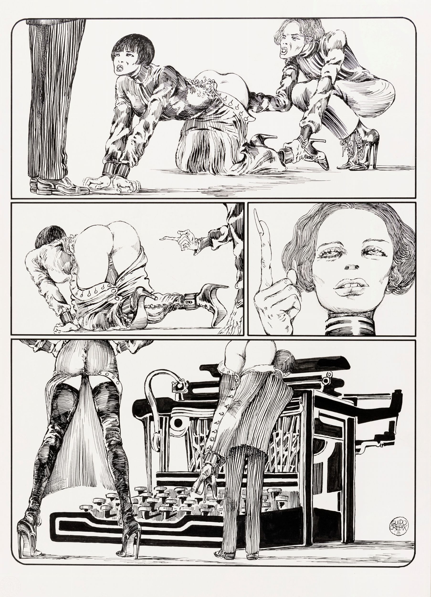 matita e china su cartone, 36,5 x 51 cm 1976 Tavola originale realizzata da Crepax per la pag. 5 di Lanterna magica, avventura della sensuale Valentina edita per la prima volta dalla Editiemme nel 1979. Unico racconto a fumetti di Crepax senza parole Lanterna magica è da considerarsi una delle sue opere più oniriche, Valentina insonne si appisola e si risveglia e, nel suo dormiveglia, flusso di coscienza e sogno si intrecciano in un susseguirsi di visioni passando nei vari mondi che sono stati teatro delle sue avventure. Firmata e datata.
