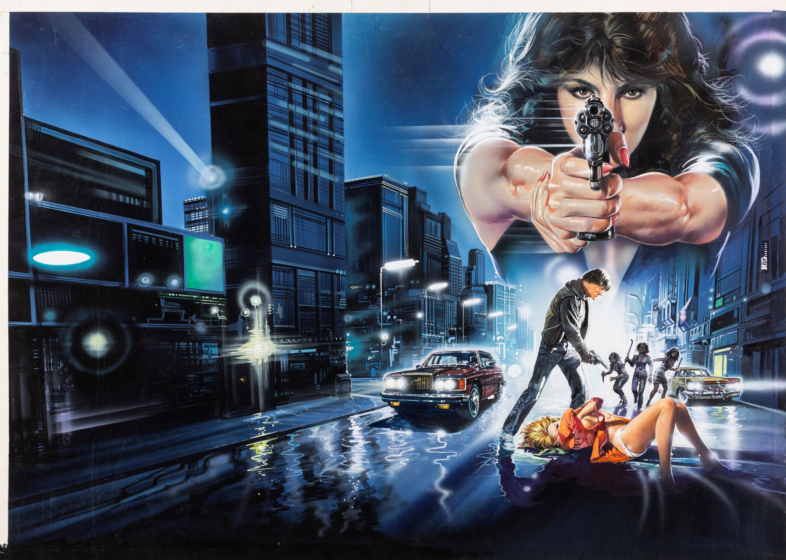 tempera e aerografo su cartone, 71 x 51 cm 1987 Bozzetto originale realizzato da Casaro, all’interno del suo studio di Monaco di Baviera, per la locandina ufficiale del film W.A.R. Women Against Rape, diretto da Raphael Nussbaum con Frank Stallone, Donna Denton, Martin Landau e Terry Moore nel 1987.