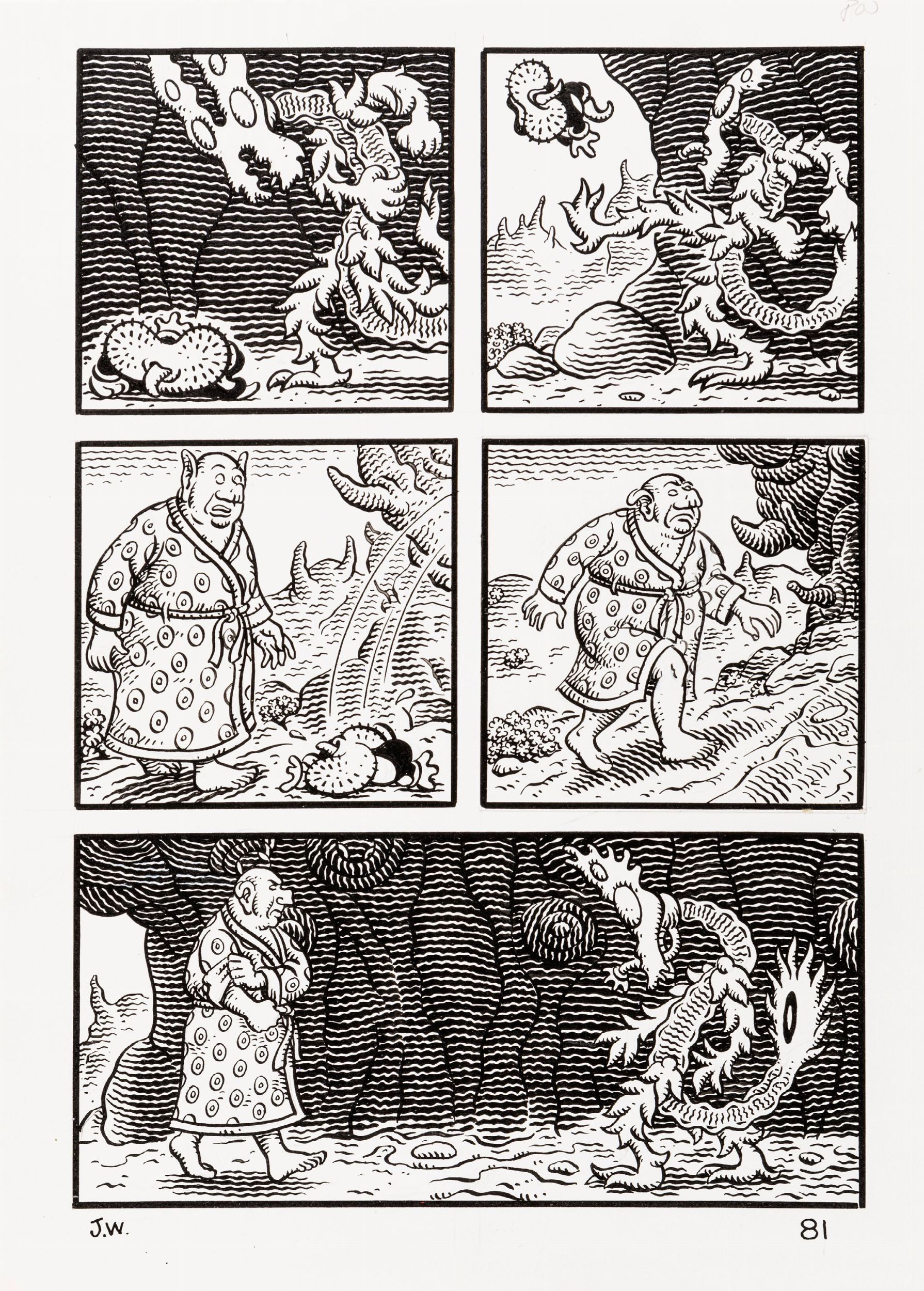 2010 Tavola originale realizzata da Woodring per la sua prima graphic novel Weathercraft edita in Italia dalla Coconino Press nel 2010. Considerato il suo capolavoro, Weathercraft esprime al massimo la capacità di Woodring nel combinare l'ingenuità di un disegno stile Disney con una creatività nera e distorta alla Salvador Dalì. Nella seconda vignetta troviamo la sillaba sacra Om , il più sacro mantra induista che il cartoonist americano ha deciso di inserire in ogni pagina di quest'opera. Firmata.