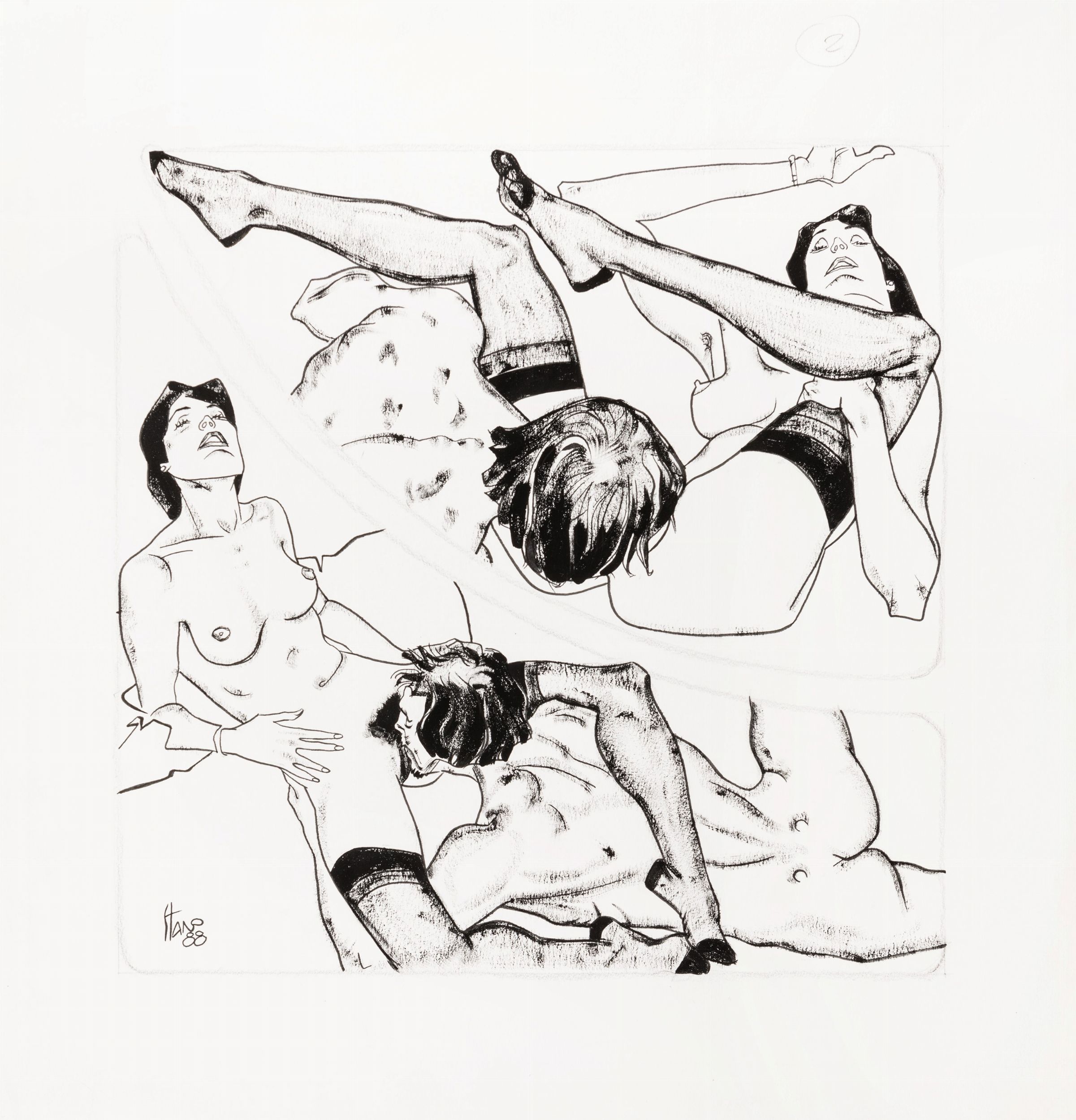 matita e china su cartoncino, 37 x 38,5 cm 1988 Illustrazione originale realizzata da Stano a corredo di alcuni passaggi del romanzo Women di Charles Bukowski edito sulle pagine della rivista Glamour International n. 12 nel 1988. Un meraviglioso esempio di come Stano sia un artista a tutto tondo (qui fortemente influenzato da Egon Schiele) e non solo il creatore di Dylan Dog. Firmata e datata.