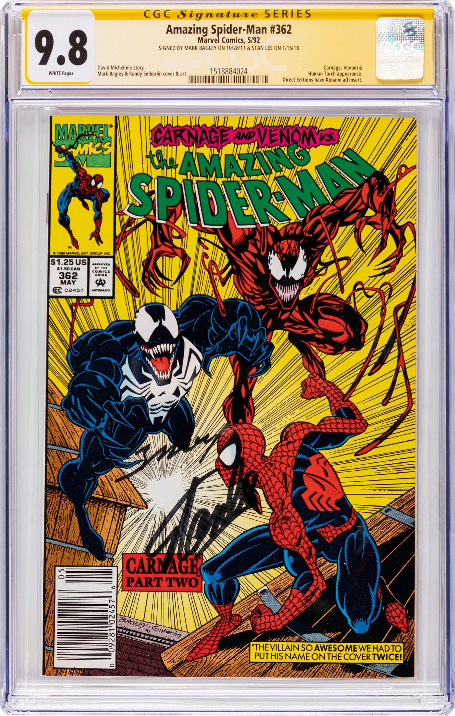 Page Quality: WHITE, Grade: 9.8 1992 Comic book certificato dalla CGC con un grading 9.8 (CGC Cert # 1518884024), case sigillato e in ottime condizioni. CGC Comments: Carnage, Venom & Human Torch appearance. SIGNED BY MARK BAGLEY ON 10/28/17 & STAN LEE ON 1/15/18.