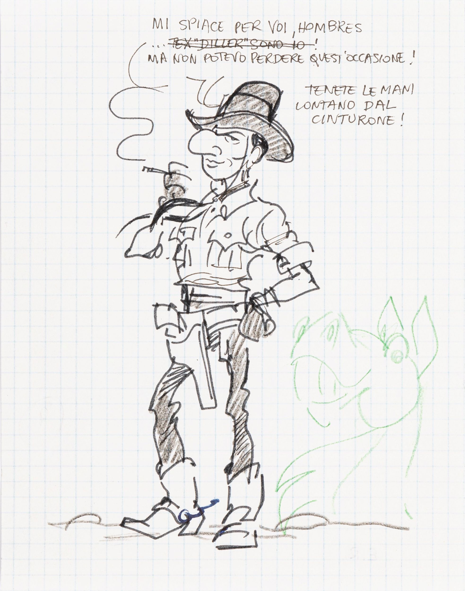 pastello e china su carta, 15 x 19,5 cm 1990 Autoritratto originale realizzato da Magnus nel 1990 come scherzoso omaggio al suo Tex in quel momento alle prime fasi di lavorazione, opera pubblicata sulla monografia della Glittering Images a pag. 215 nel 1997.