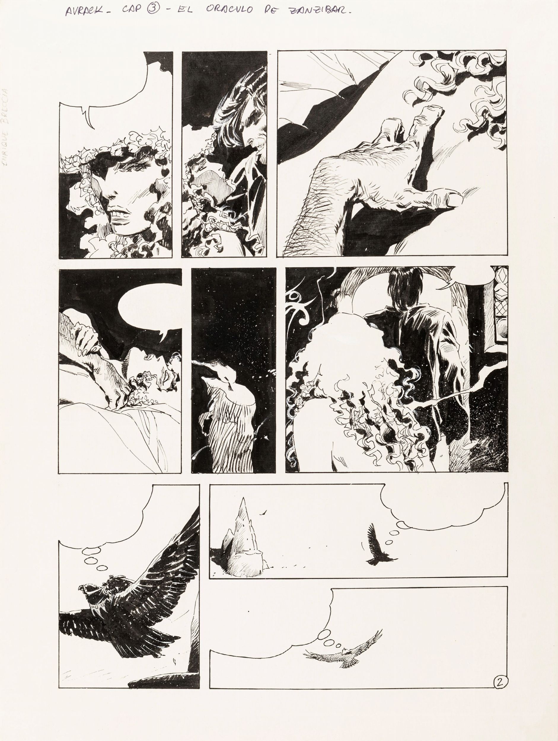 matita e china su cartoncino, 30 x 40 cm 1987 Tavola originale realizzata da Breccia per El oráculo de Zanzibar, pag. 2 del terzo capitolo di Avrack, saga fantascientifica edita per la prima volta in argentina su Super Skorpio n. 141 nel 1987. Testi di Ricardo Barreiro.