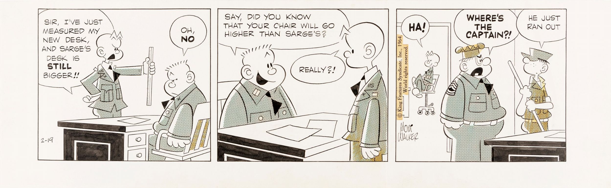 19/02/1964 Striscia giornaliera del 19/02/1964 per Beetle Bailey. Piega verticale tra la seconda e terza vignetta. Firmata e datata.