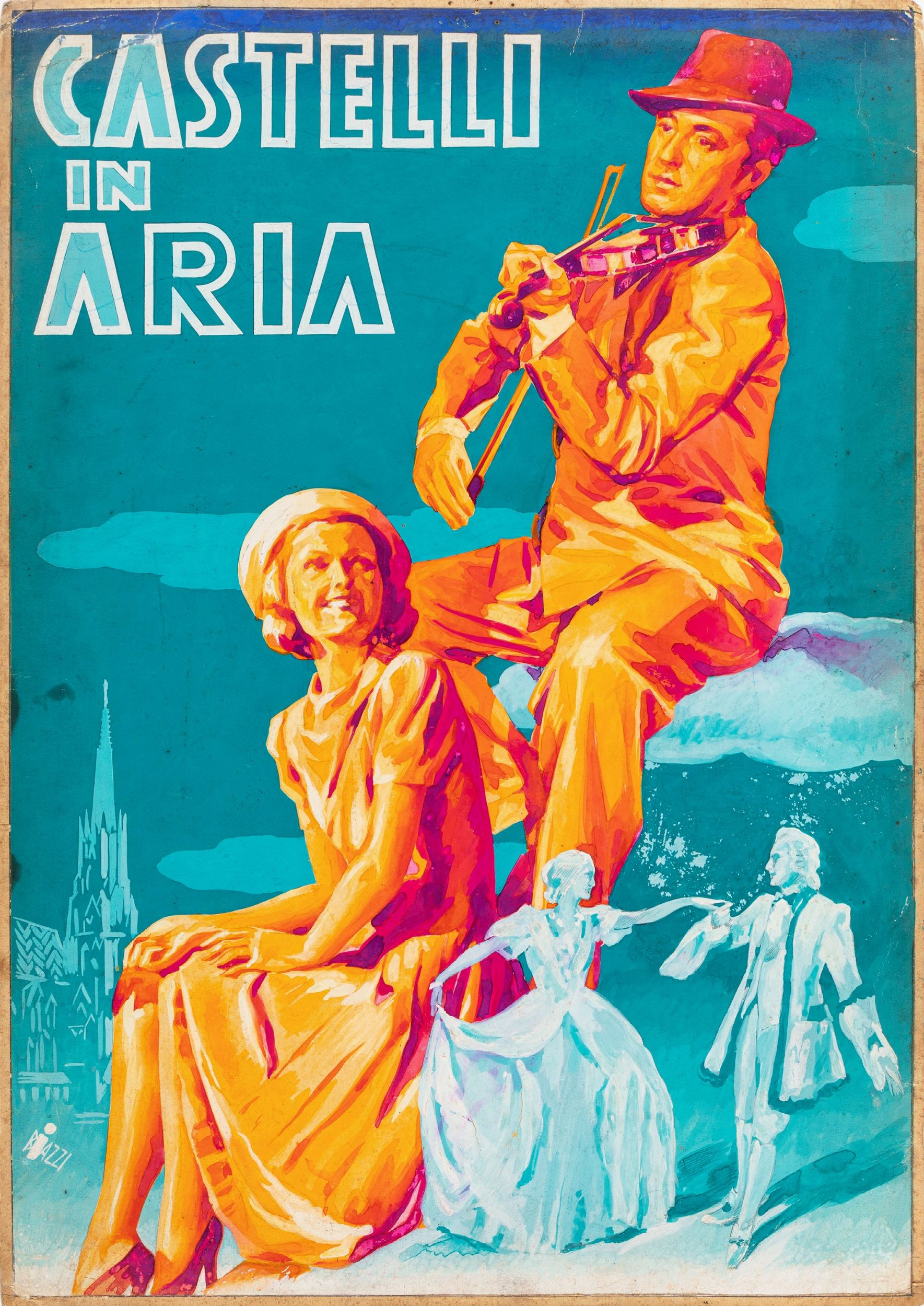 tempera su cartoncino, 37,5 x 53 cm 1939 Bozzetto originale realizzato da Biazzi per la locandina ufficiale del film Castelli in aria, diretto da Augusto Genina con Lilian Harvey e Vittorio De Sica nel 1939. Fori di affissione e lievi pieghe al margine superiore. Firmato.