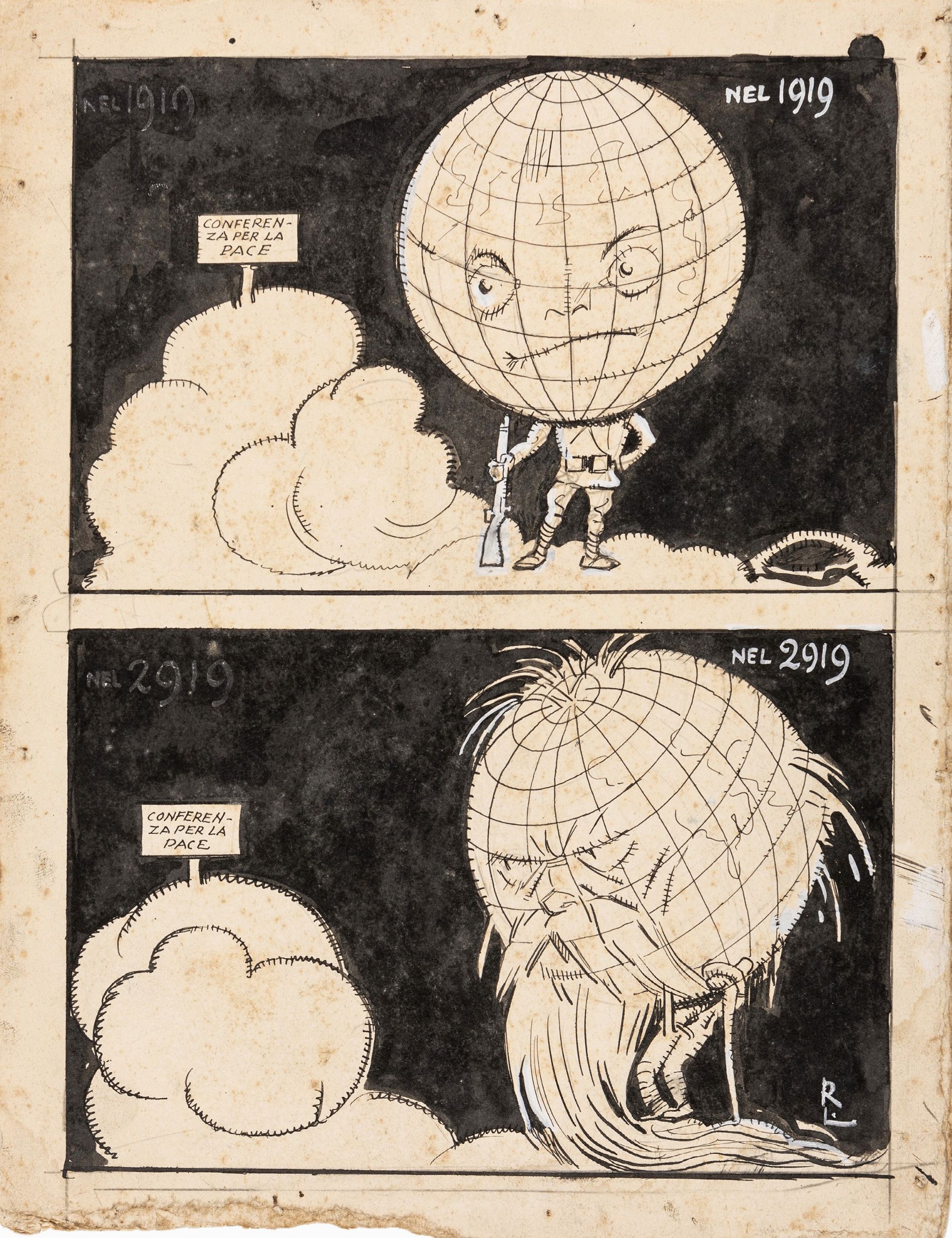 matita e china su cartoncino, 26 x 33 cm 1919 Illustrazione originale realizzata da Galantara per la rivista di satira politica L'Asino. Galantara, insieme a Podrecca, fu fondatore della storica rivista romana che vide la luce nel 1892 e che fu il punto di riferimento per la cultura capitolina fino al 1925, anno della sua chiusura forzata a causa della censura fascista e dell'incarcerazione dello stesso Galantara. Fori di affissione e mancanze ai margini. Firmata.