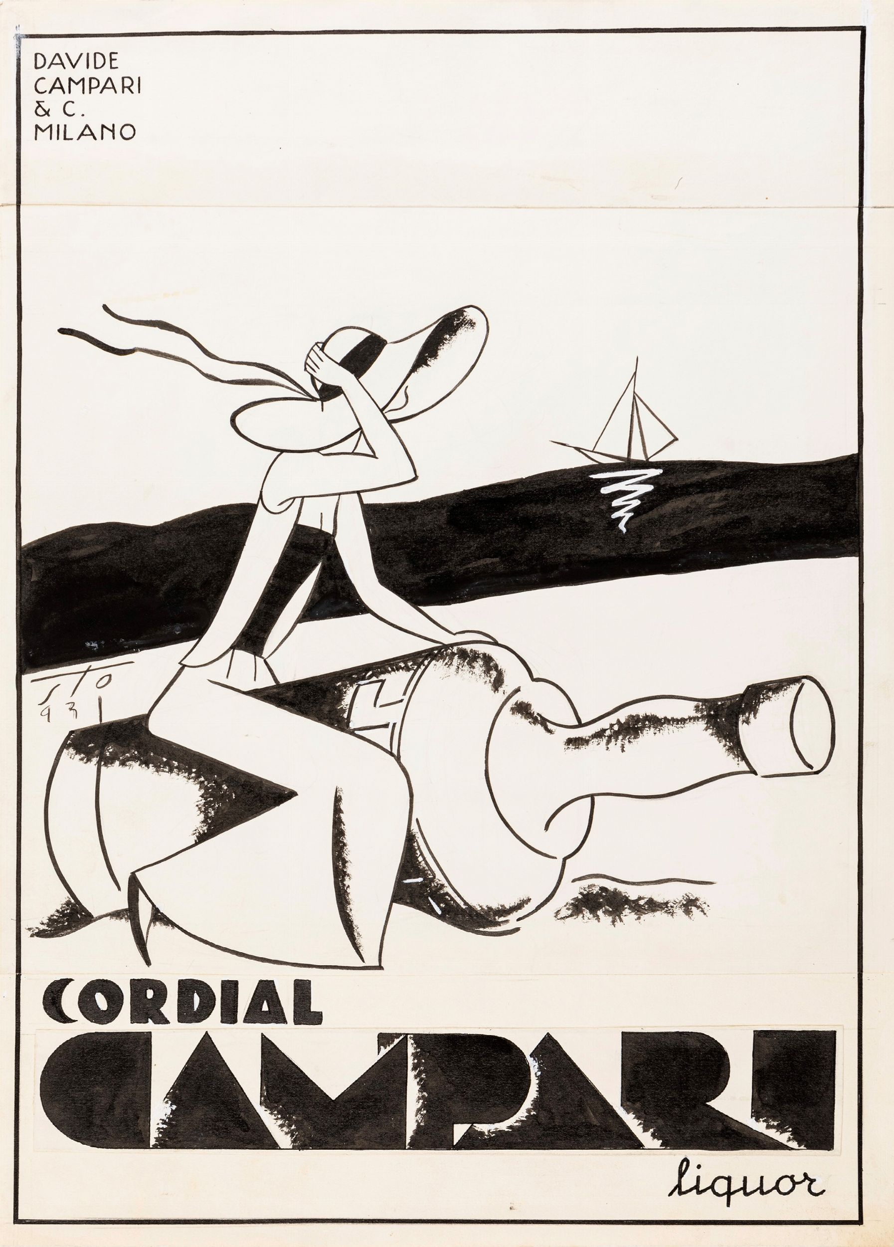 matita e china su cartoncino, 28 x 38,5 cm 1931 Illustrazione originale realizzata da Tofano per una delle sue celebri campagne pubblicitarie della Campari. Poliedrico e geniale, Tofano presta la sua brillante inventiva a diversi marchi italiani durante il primo Dopoguerra tra cui Barilla, Zucca e Campari. Firmata e datata.