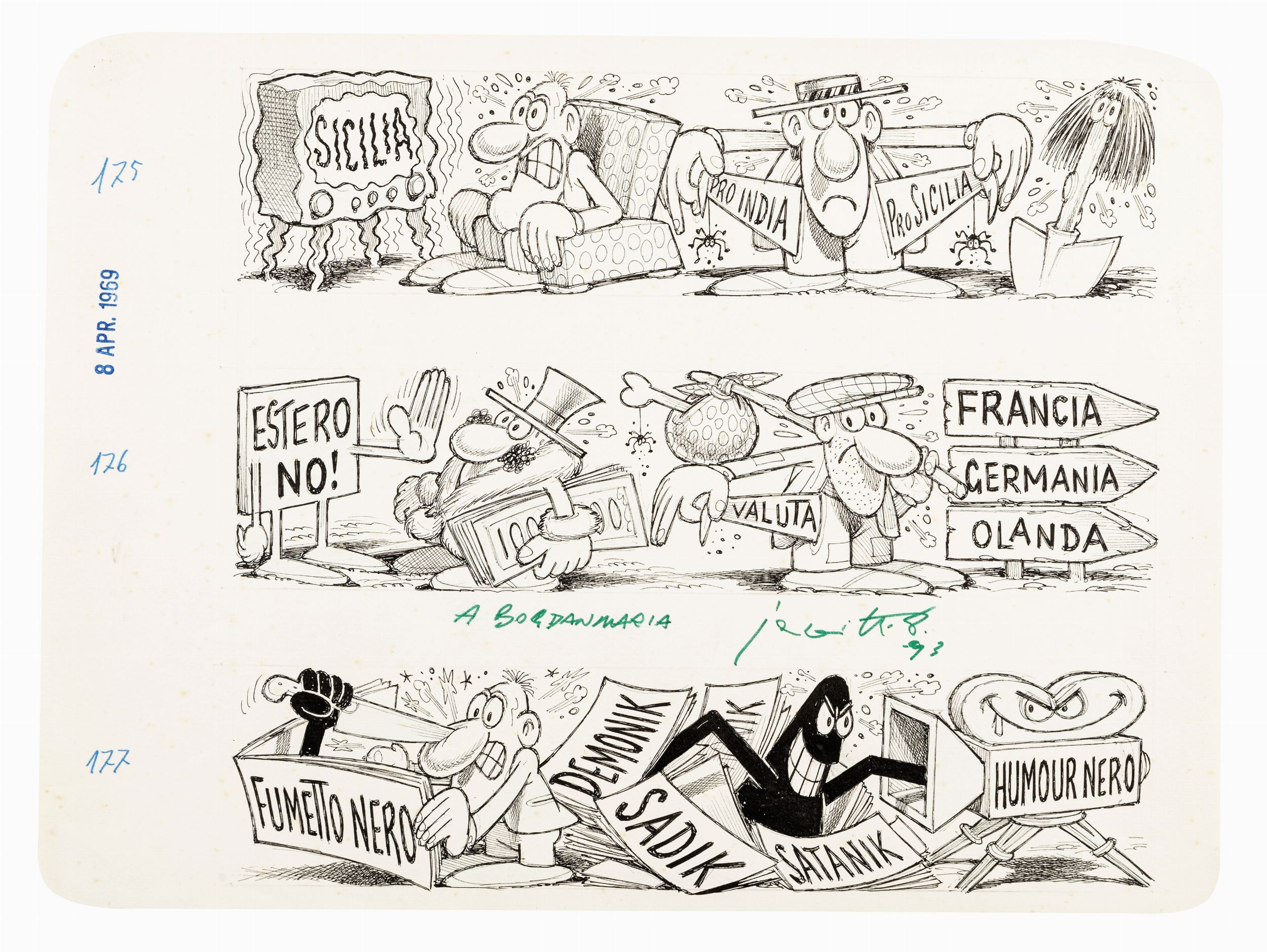 1969 Disegno originale realizzato da Jacovitti contenente 3 strisce originali pubblicate sulle pagine del Diario Vitt 1969 dalle Edizioni AVE. Acquerellato al retro. Firmato, datato e dedicato.