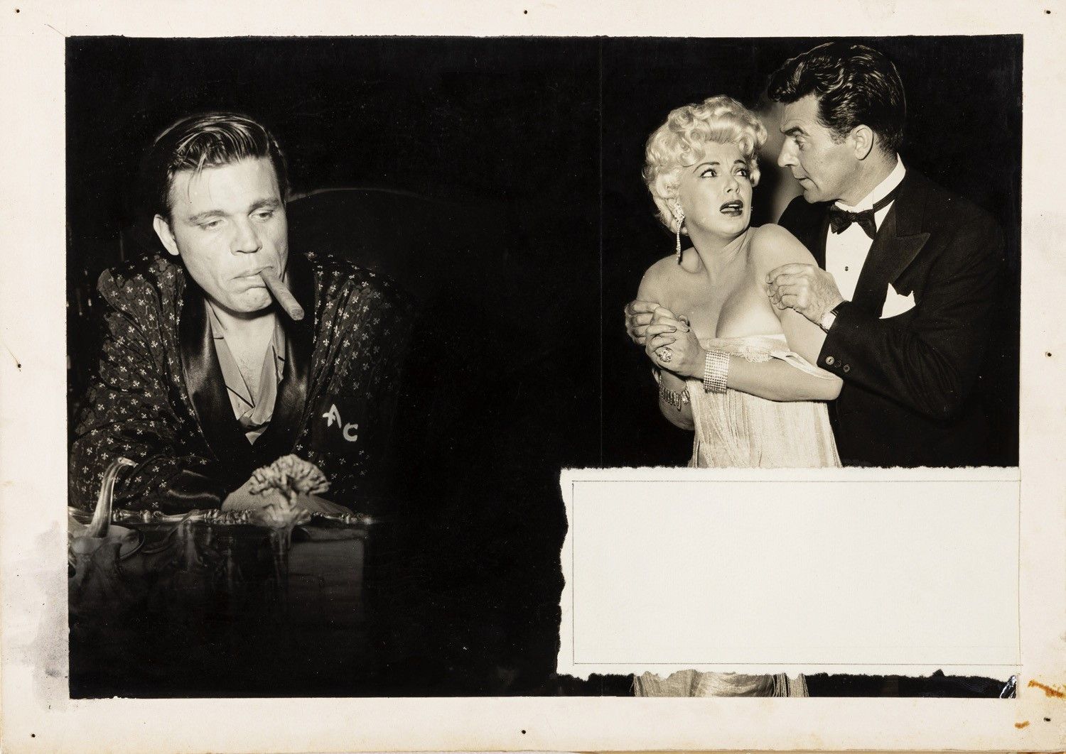 tempera su cartone e pellicola fotografica applicata su cartone, a) 47,5 x 18 cm b-c-d) 25 x 35 cm e)35 x 25 cm 1959 Lotto composto dalla versione italiana del titolo del film F.B.I. contro Al Capone diretto da Phil Karlson con Robert Stack, Neville Brand e Barbara Nichols nel 1959 e da 4 flani fotografici (immagine promozionale destinata a giornali e sale cinematografiche).