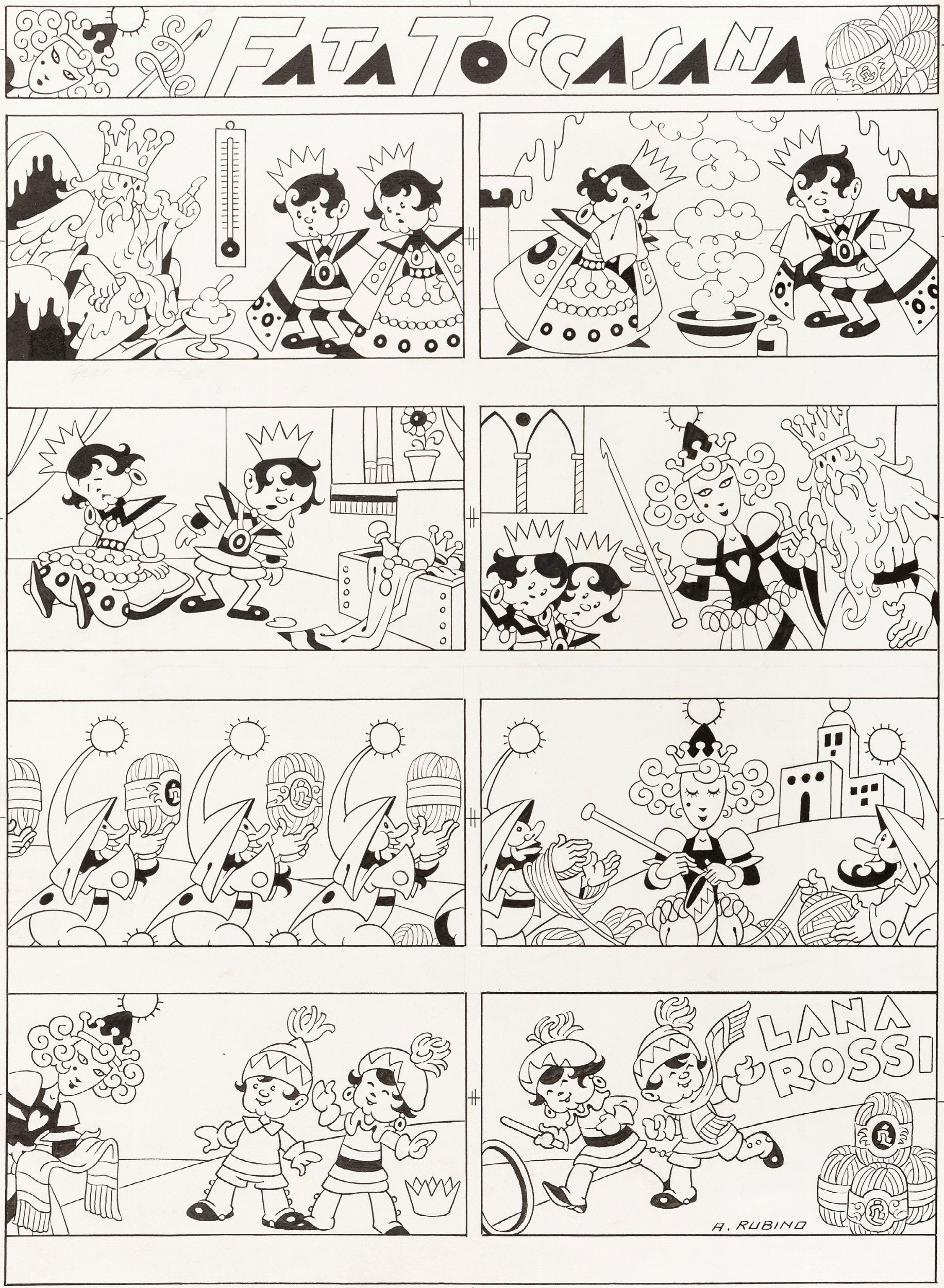 matita e china su cartoncino, 36,5 x 50 cm 1931 Tavola originale realizzata da Rubino intitolata Fata Toccasana, pubblicata sul quindicinale promozionale Mondo Bambino anno II n. 6 a pag. 12 dai Grandi Magazzini La Rinascente di Milano nel 1931. Un´opera che fonde il fumetto e la pubblicità (il riferimento alla Lana Rossi non è per niente velato) creata dal maestro sanremasco nel brevissimo periodo in cui sarà proprio direttore e redattore di questo mitico periodico milanese destinato ai più piccoli. Piega orizzontale al centro. Firmata.