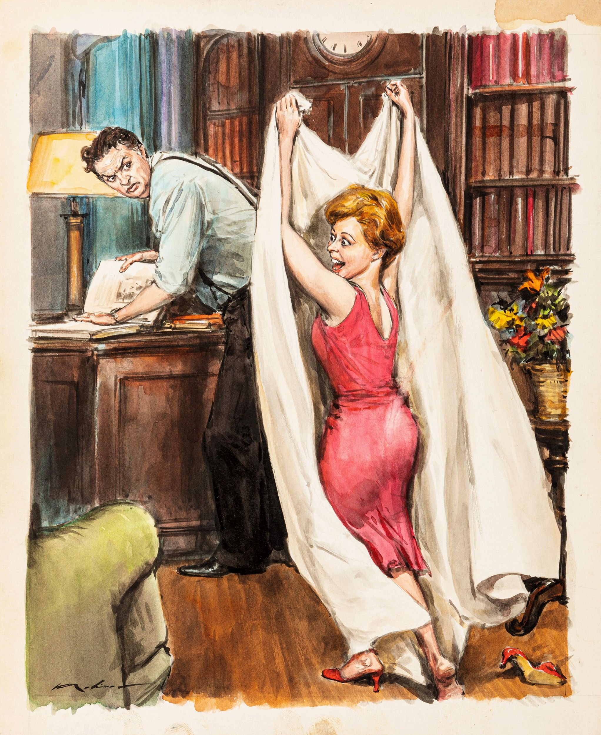 tempera e acquerello su cartoncino, 29 x 35,5 cm anni '60 Illustrazione originale realizzata da Molino durante gli anni ’60 per la rivista francese di cinema e spettacolo Festival. Firmata.