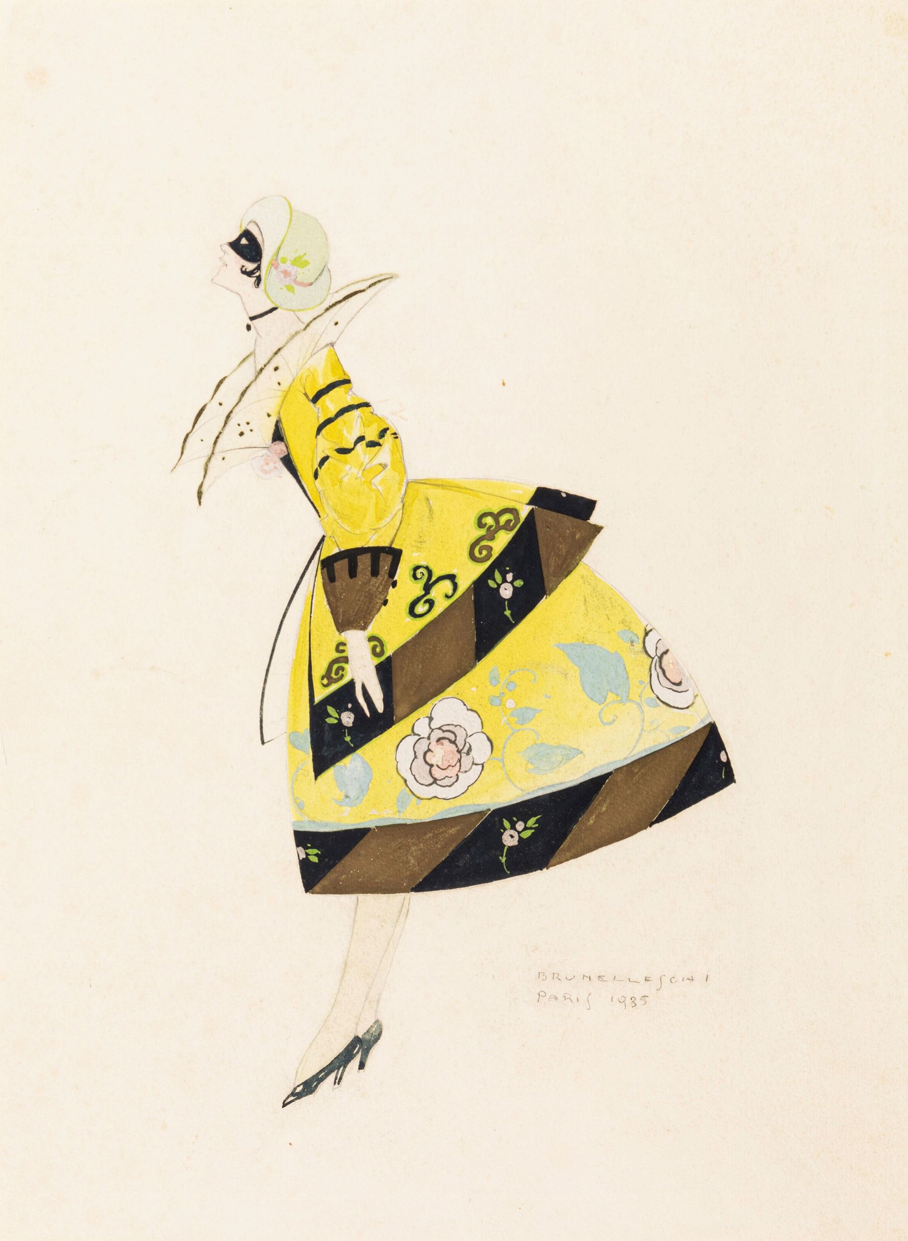 matita, china e tempera su cartoncino, 26 x 36 cm 1935 Figurino teatrale realizzato da Brunelleschi durante la sua permanenza a Parigi nel 1935. Opera pubblicata sul volume Non solo Erté di Angelo Luerti a pag. 78 dalla Little Nemo Ed. nel 2013. Con le sue figure femminili filiformi in abiti sfarzosi e arabeggianti Brunelleschi è uno dei protagonisti della Belle Epoque francese. Firmato e datato.