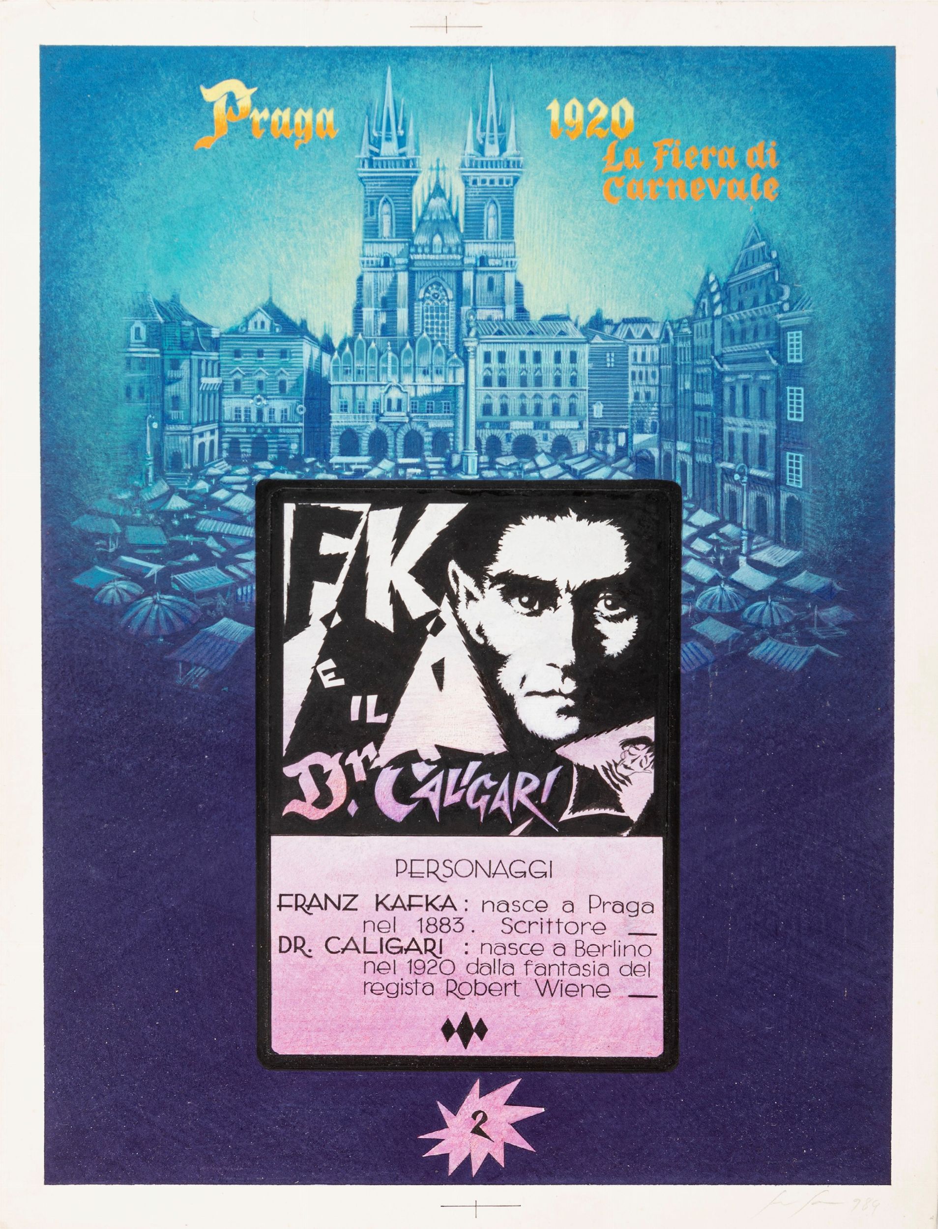 tecnica mista su cartone, 25,5 x 33,5 cm 1984 Title page originale realizzata da SeSar per FK e il Dottor Caligari, edita sulla rivista Corto Maltese n. 35 nel 1985. L'amore per il cinema e per le commistioni di genere sono elementi fondamentali nella produzione artistica di Sesar. Firmata e datata.