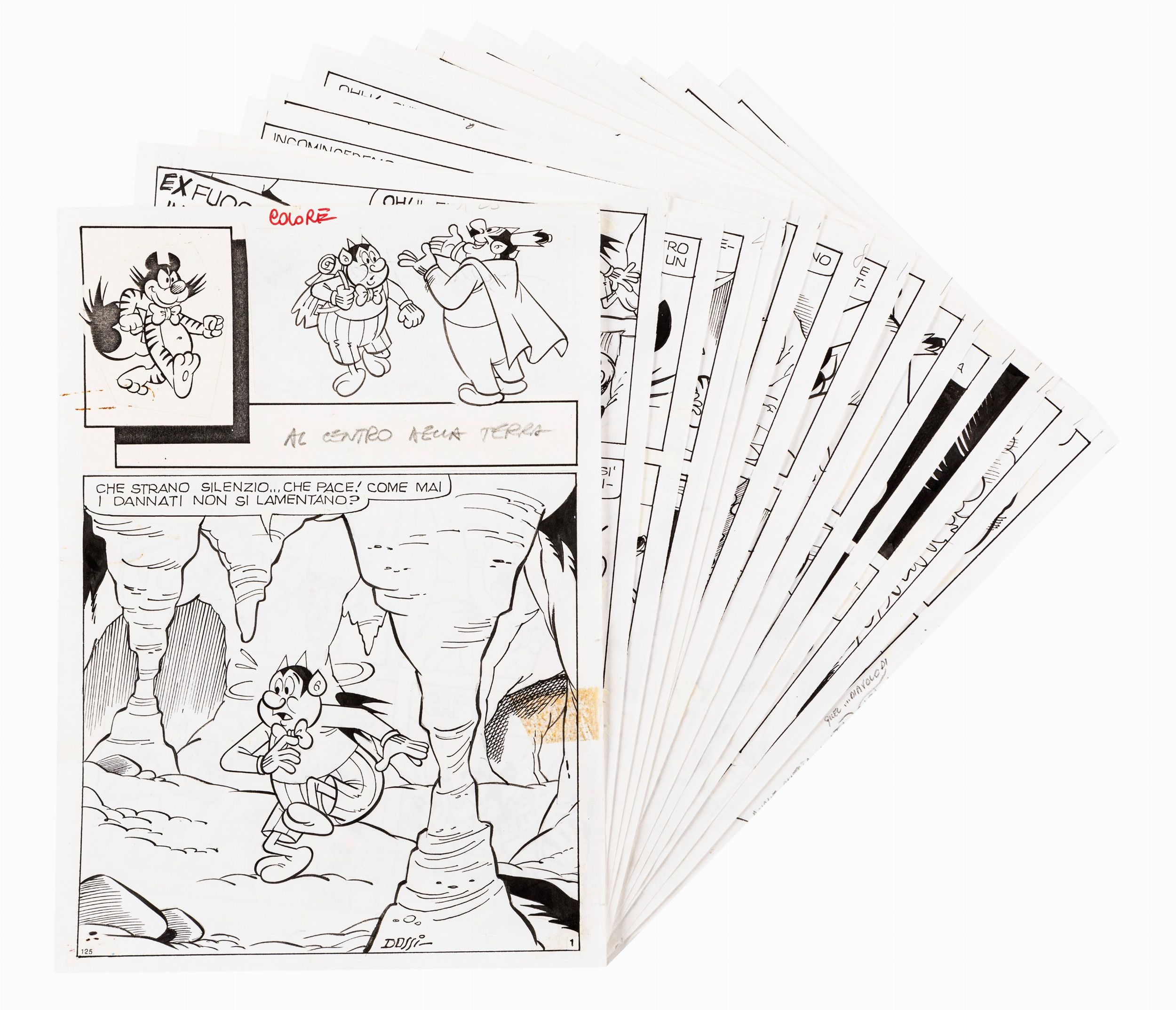 matita e china su carta, 19,5 x 27,5 cm 1985 Storia completa composta da 16 tavole originali realizzate da Dossi per Al centro della terra, avventura del buon diavolo Geppo pubblicata su Geppo n. 125 dalla Bianconi nel 1985. Ogni pagina firmata al retro.