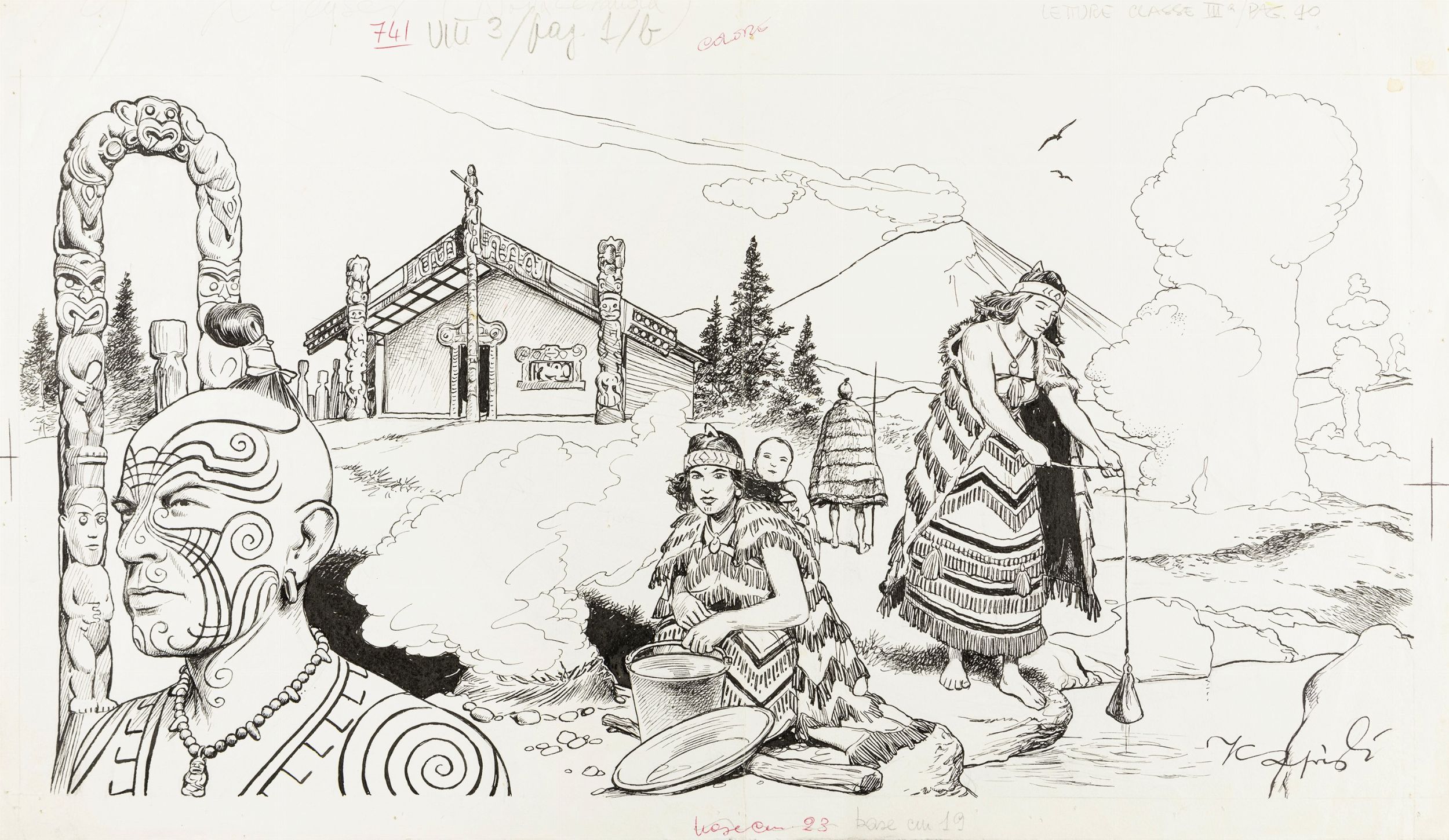 matita e china su cartoncino, 55 x 32 cm anni '60 Illustrazione originale realizzata da Caprioli nei primi anni '60 per un approfondimento sui nativi americani all'interno delle pagine de Il Vittorioso. Fori di affissione ai margini, piega verticale al centro e agli angoli. Acquerellata al retro. Firmata