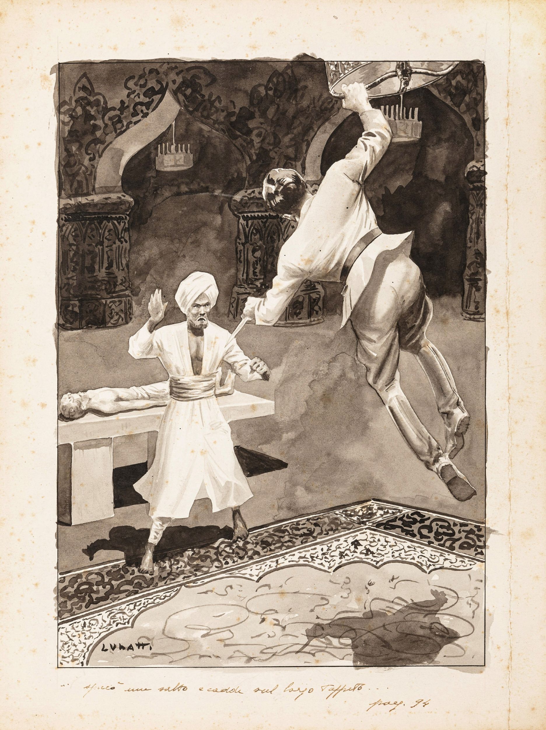 1945 Illustrazione originale realizzata da Lubatti per il romanzo I Tughs alla riscossa di Emilio Salgari, edita dall´editrice Impero nel 1945. Piega verticale al margine destro. Firmata.