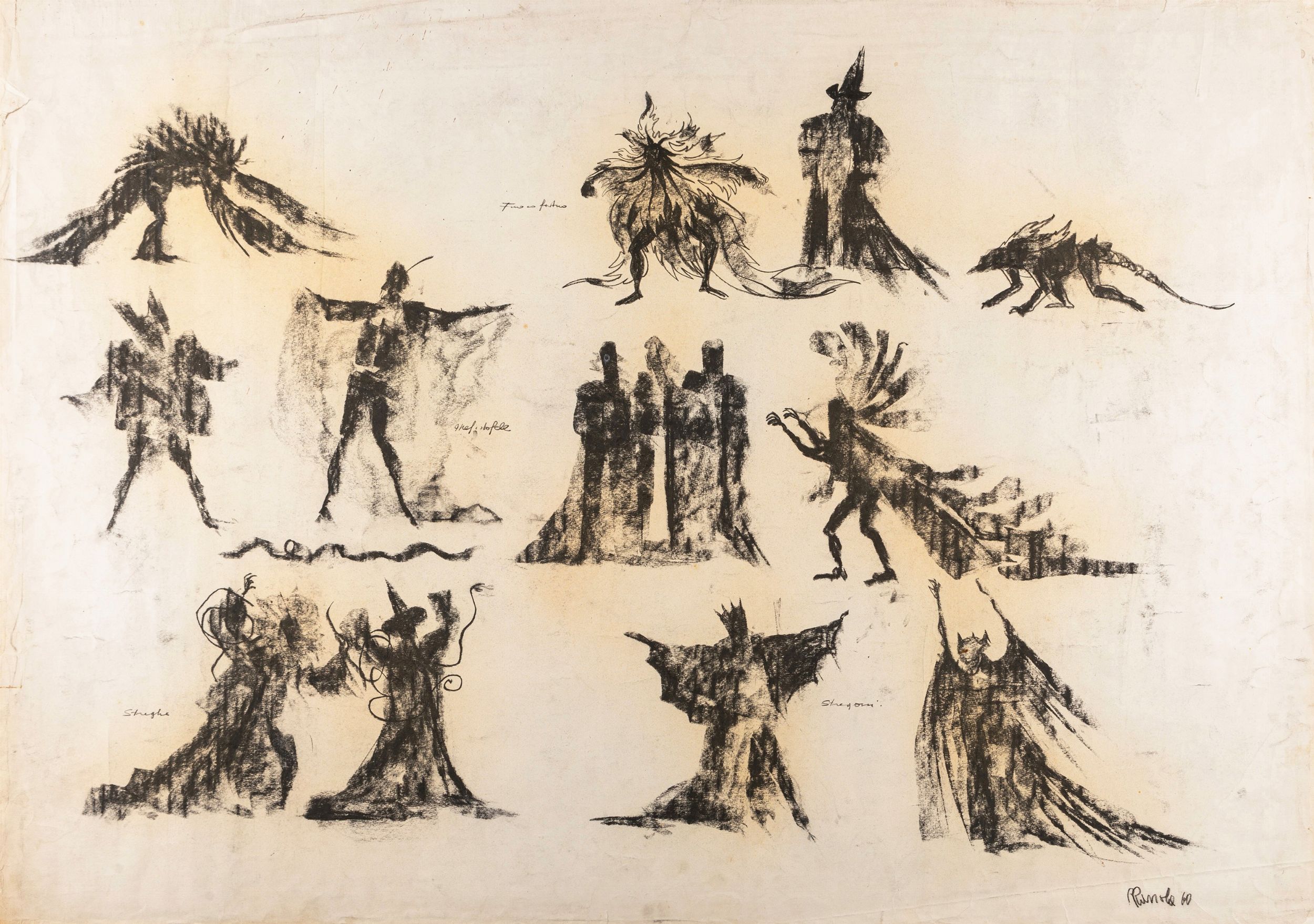 1960 Studio per i personaggi realizzato da un giovanissimo Raviola (ventunenne scenografo presso l'Accademia di Belle Arti di Bologna) per il dramma sacro medievale Il miracolo di Teofilo di Rutebeuf. Gli anni dell'Accademia furono fondamentali per la formazione del giovane Raviola, in questi figurini teatrali in cui agli annotò il ruolo (Mefistofele, Fuoco fatuo, Streghe e Stregoni) possiamo già scorgere lo stile e il genio del futuro Magnus. Al retro un ulteriore studio per quella che sembra essere una battaglia della Guerra di Secessione Americana. Di grande rarità. Piccoli strappi e pieghe ai margini. Firmata e datata.