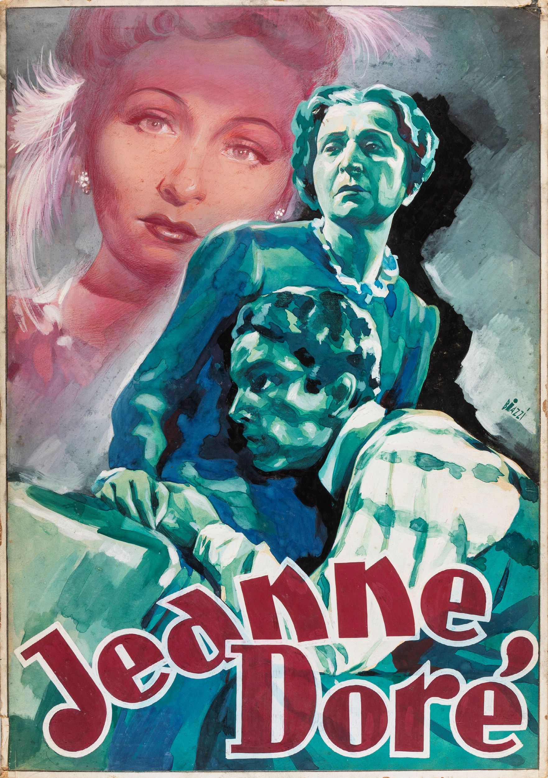 tempera su cartone, 35 x 50,5 cm 1938 Bozzetto originale realizzato da Biazzi per la locandina ufficiale del film Jeanne Doré, diretto da Mario Bonnard con Emma Gramatica, Sergio Tofano e Evi Maltagliati nel 1938. Lieve piega all'angolo superiore destro. Firmato.