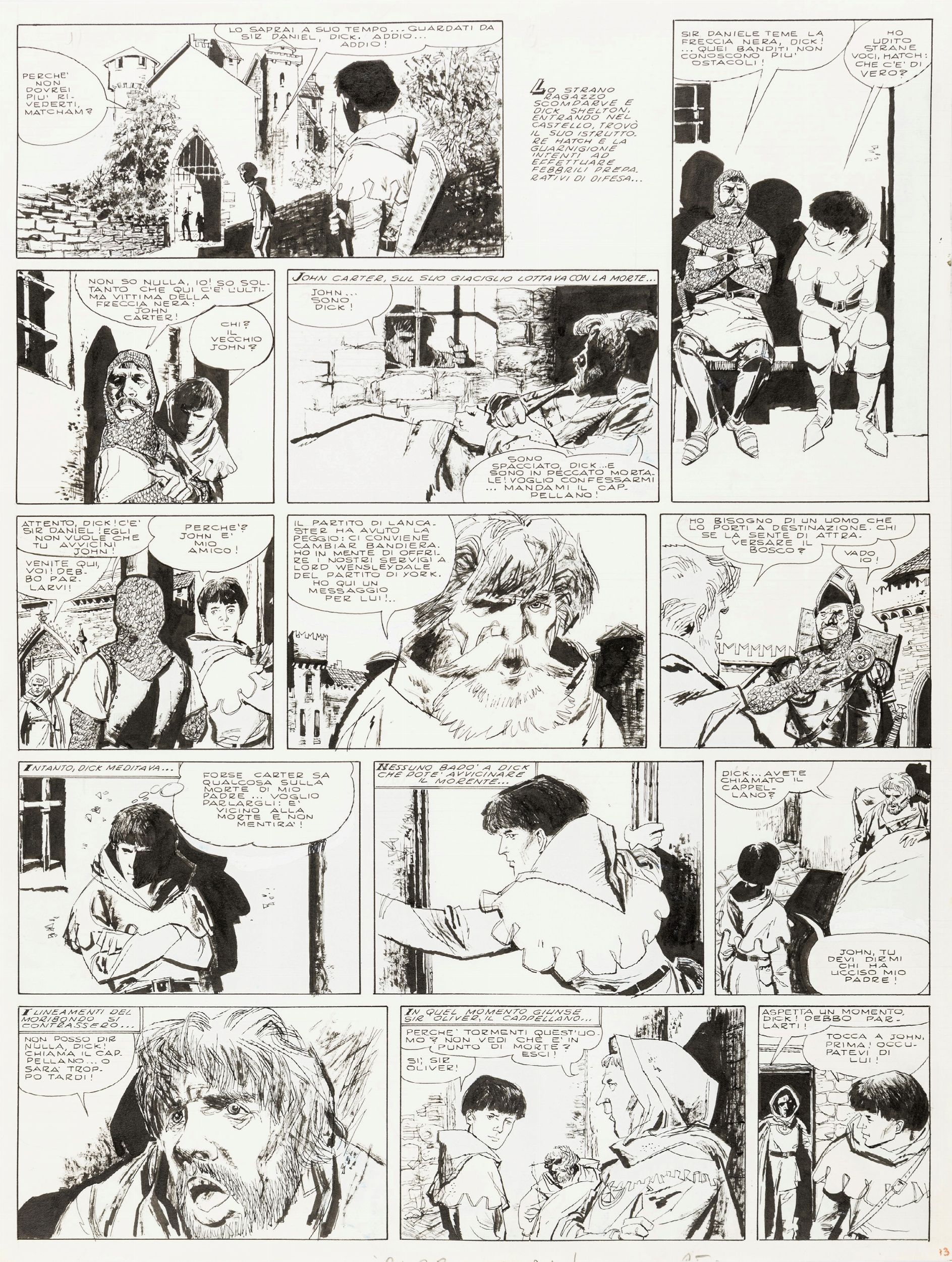 matita e china su cartoncino, 33,5 x 44 cm 1963 Tavola originale realizzata da Battaglia per la pag. 13 de La freccia nera, adattamento a fumetti del classico di Robert Louis Stevenson edito per la prima volta nel 1963 e successivamente sul volume I Crociati dalle edizioni Il Gatto e la Volpe nel 1982. Un´opera intensa e tecnicamente sublime che segna il primo periodo artistico di Battaglia, già proiettato verso quella maturità che lo collocherà tra i più grandi maestri del fumetto mondiale. Colorata a tempera al retro.