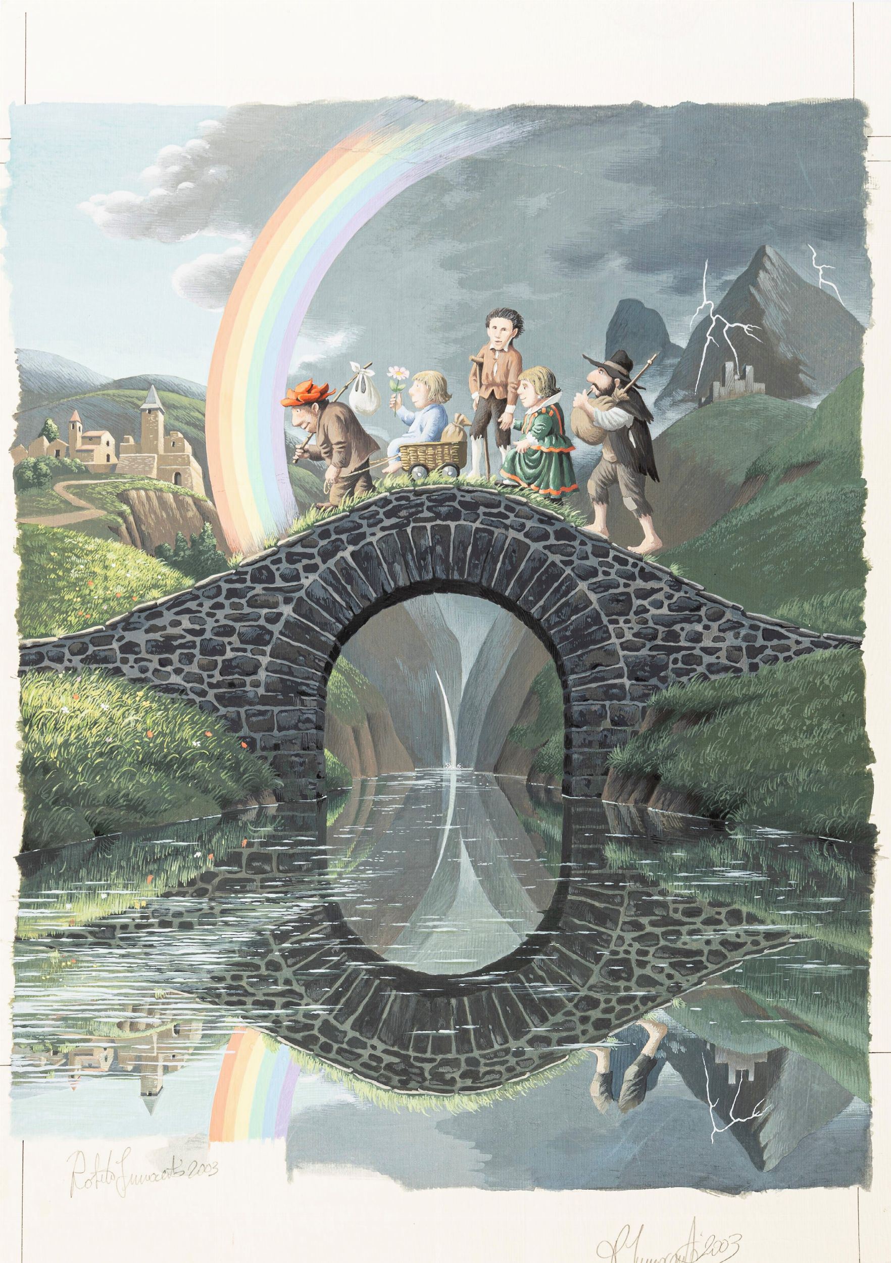 tempera su cartoncino, 28,5 x 40 cm 2003 Originale di copertina realizzato da Innocenti per il libro L'accidentato viaggio di Berto e gli altri a cura di Maria Milvia Morciano, edito da Città Aperta nel 2003. Piega verticale al margine superiore. Di grande rarità reperire le opee di Innocenti sul mercato. Firmato e datato.