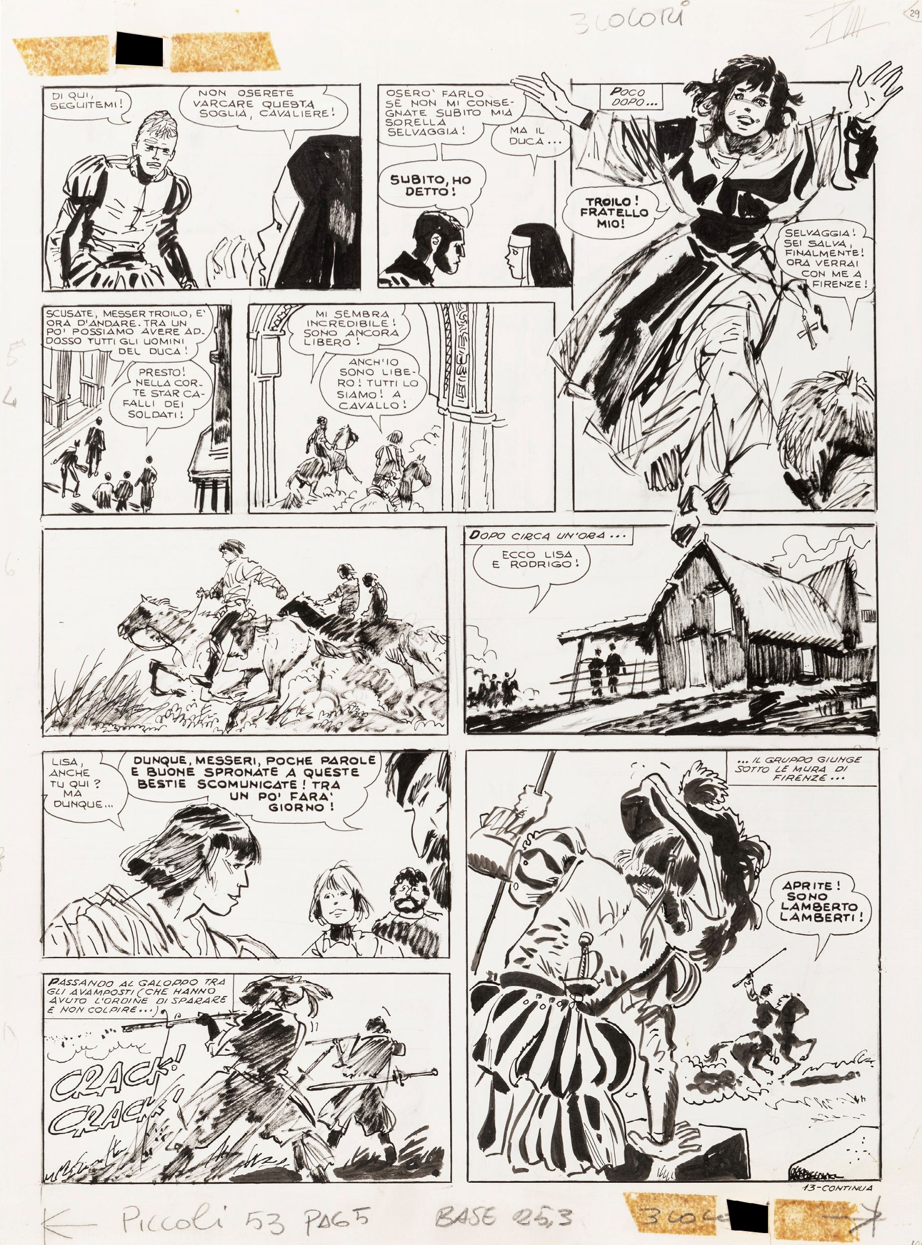 matita e china su cartoncino, 28 x 38 cm 1967 Tavola originale realizzata da Pratt per Le avventure di Fanfulla, pag. 29 di questa avventura che narra le gesta del soldato di ventura Fanfulla da Lodi, pubblicata per la prima volta a episodi sulle pagine del CdP tra il 1967 e il 1968. Fori di affissione al margine superiore. Colorata al retro a tempera.