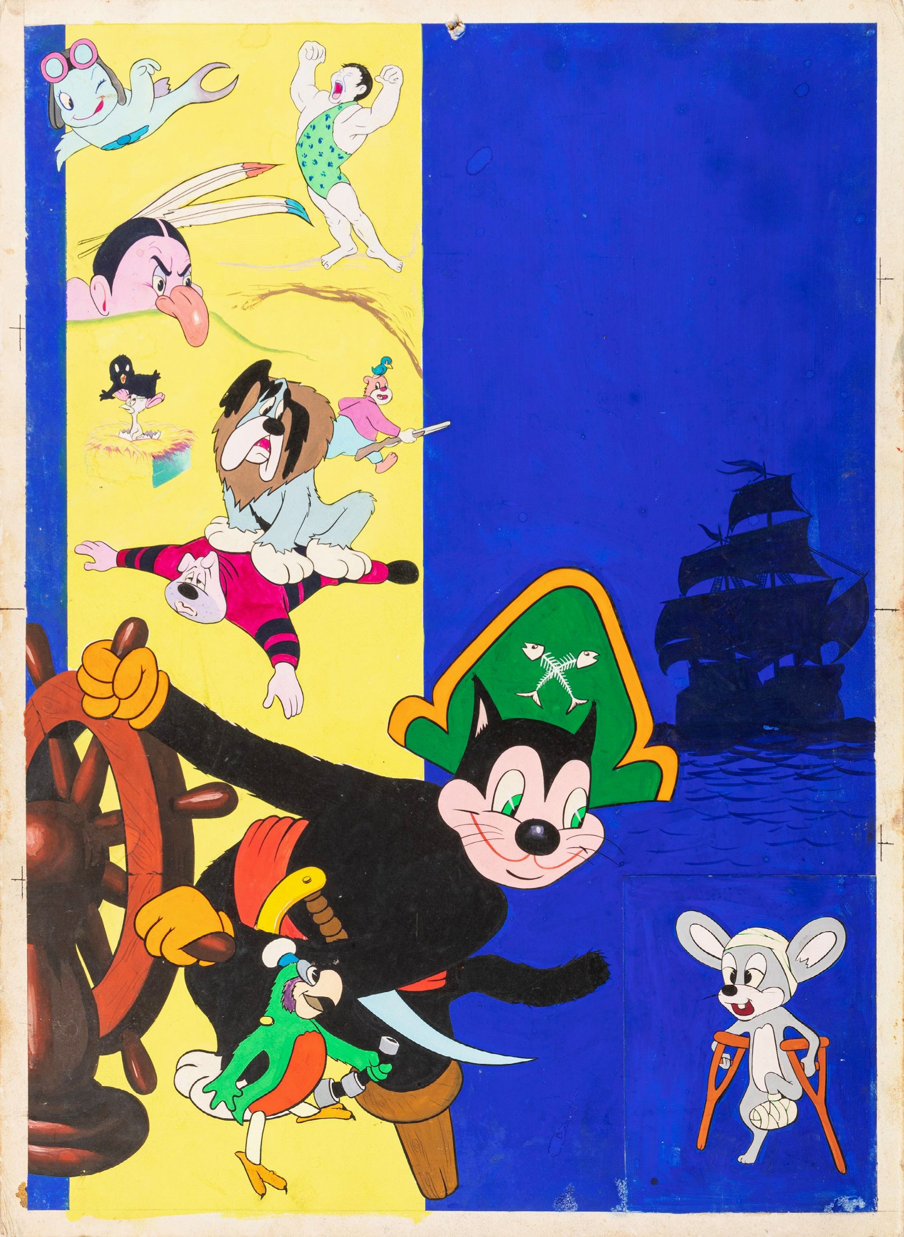 tempera su cartone, 43 x 59 cm 1963 Bozzetto originale realizzato da Napoli per la locandina ufficiale del lungometraggio animato Le Avventure di Pippo Trippa, Nicola Gorgonzola e C., prodotto da Paul Terry nel 1963. Foro di affissione al margine superiore.