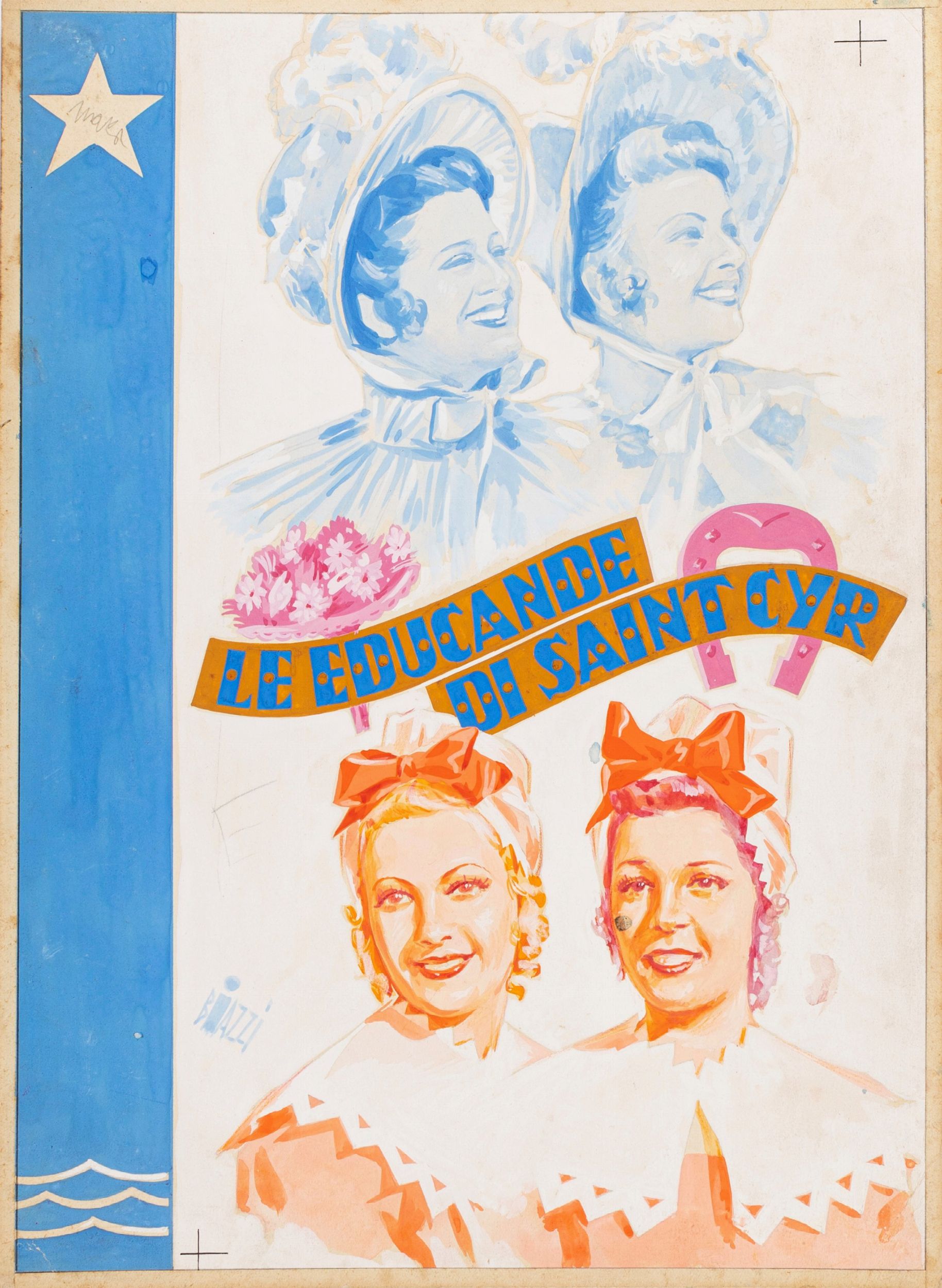 1939 Bozzetto originale realizzato da Biazzi per la locandina ufficiale del film Le educande di Saint-Cyr, diretto da Gennaro Righelli con Maurizio D'Ancora, Vanna Vanni e Silvana Jachino nel 1939. Firmato.