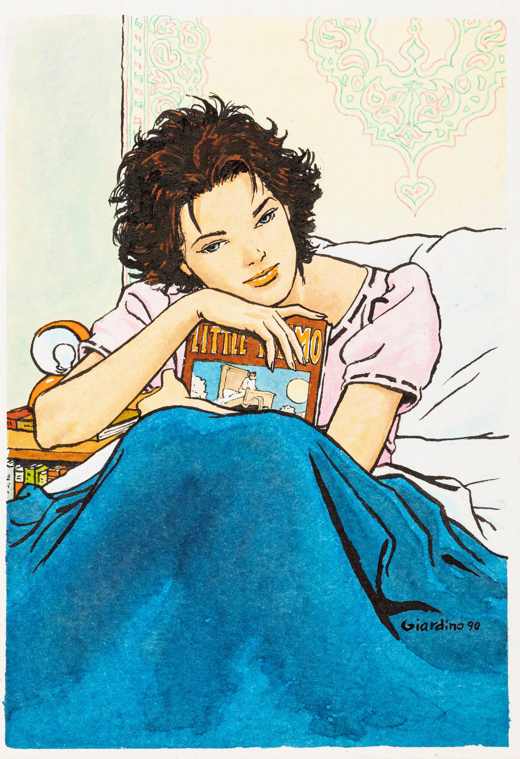 matita, china e acquerello su cartoncino, 16,5 x 24 cm 1990 Illustrazione originale realizzata da Giardino nel 1990 per la sua sensuale Little Ego. Opera ristampata innumerevoli volte, recentemente utilizzata come copertina per l'edizione deluxe del volume Erotica: Little Ego - Eva Miranda edito dalla casa editrice olandese Saga nel 2022. Una dichiarazione d'amore della dolce Ego e del suo creatore al Little Nemo di Winsor McCay. Firmata e datata al fronte e al retro con il timbro dell'autore.