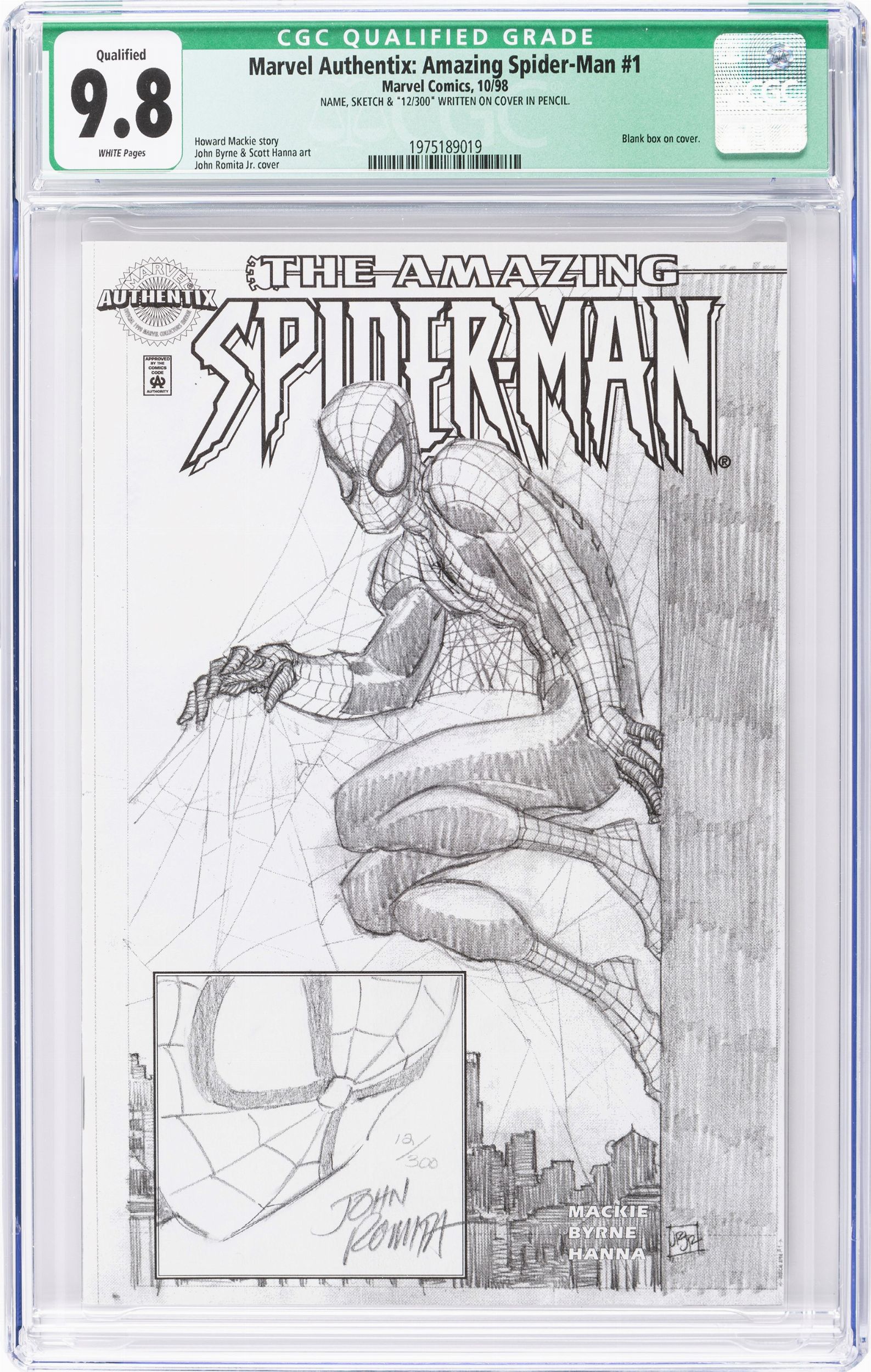 Page Quality: WHITE, Grade: 9.8 1998 Comic book certificato dalla CGC con un grading 9.8 (CGC Cert # 1975189019), case sigillato e in ottime condizioni. Disegno originale realizzato da Romita Sr. sulla copertina di Marvel Authentix: Amazing Spider-Man n. 1 edito dalla Marvel in sole 300 copie (la nostra è la 12 su 300) nel 1986. Si allega il CoA della Marvel Comics. Firmato e numerato.