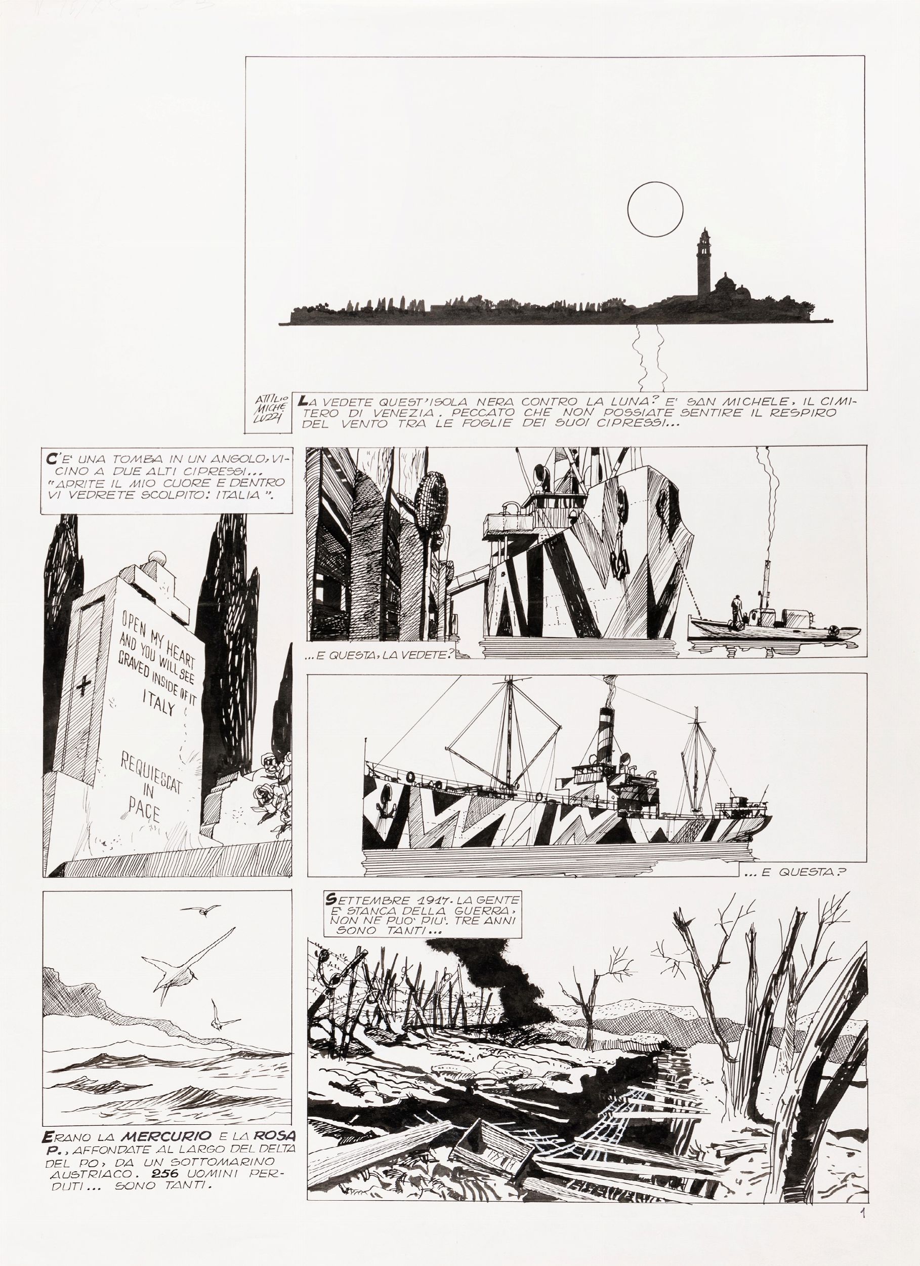 1978 Title page originale realizzata da Micheluzzi per Spie a Venezia, avventura di Petra Chérie pubblicata per la prima volta su Il Giornalino n. 10 nel 1978. Lieve piega orizzontale al centro. Firmata.
