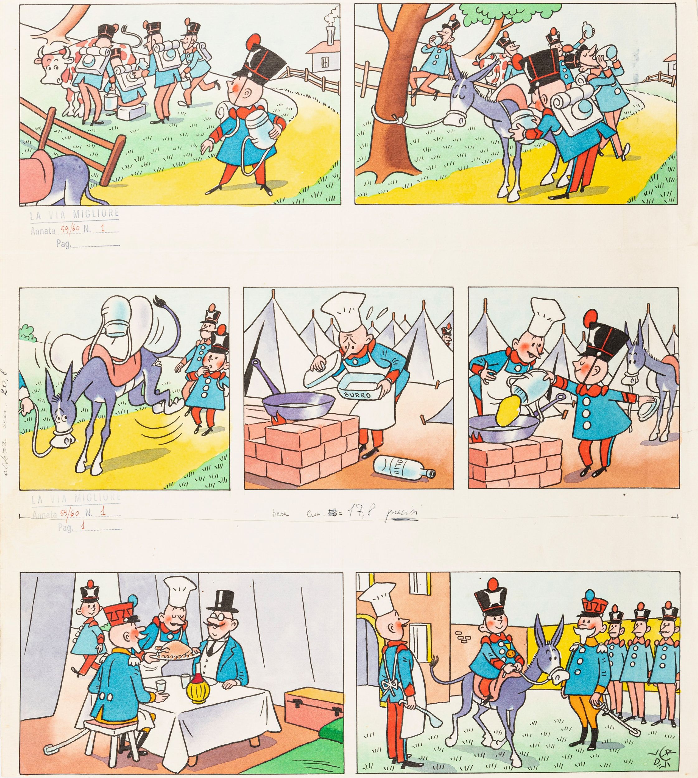 1959 Tavola originale realizzata da Verdini per Spingardino, personaggio edito sulla prima pagina del giornale La via migliore n. 5 nel 1959. Due piccoli strappi al margine destro. Firmata.