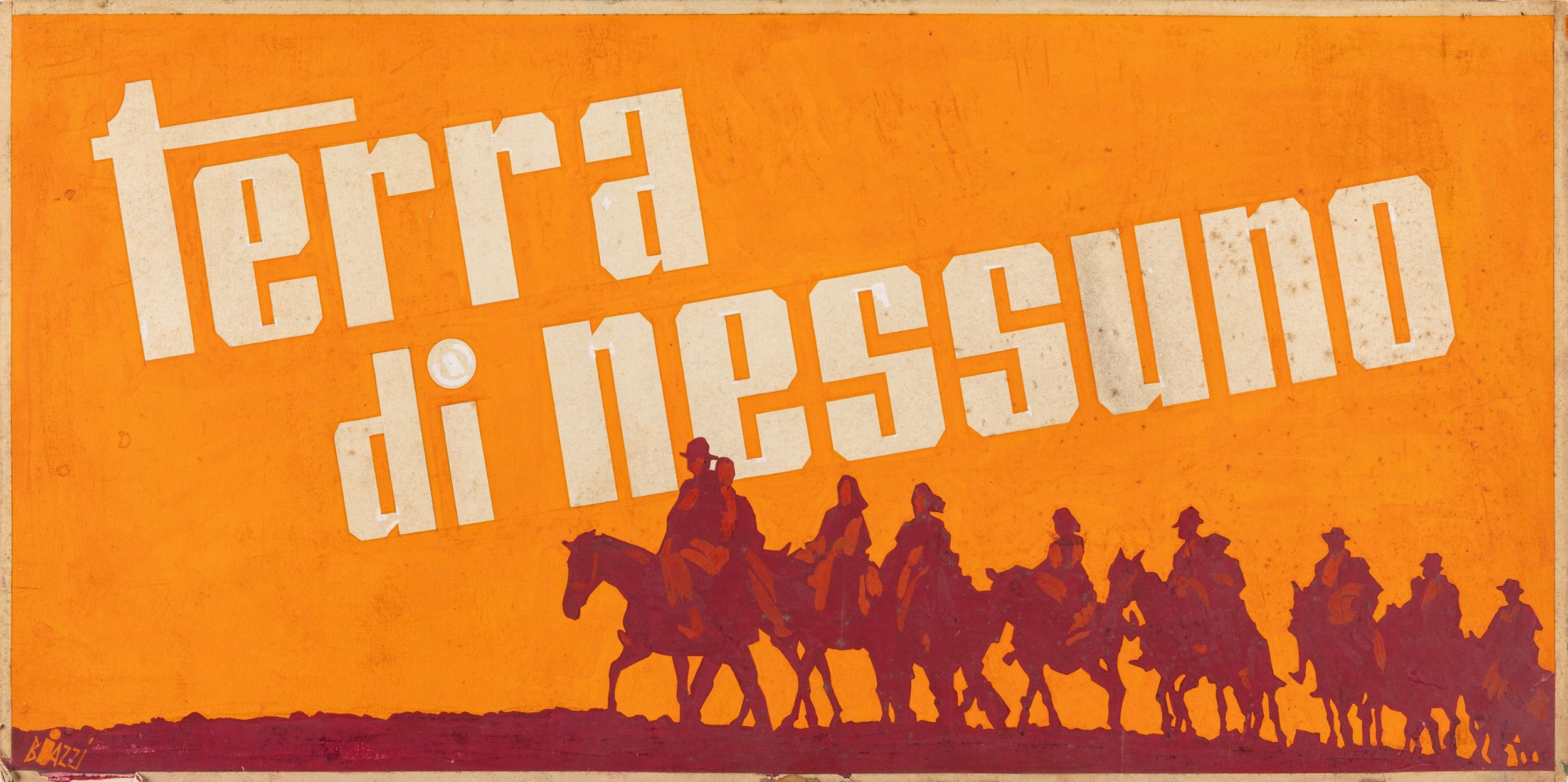 tempera su cartone, 53,5 x 26 cm 1939 Bozzetto originale realizzato da Biazzi per lo striscione ufficiale del film Terra di nessuno, diretto da Mario Baffico con Mario Ferrari, Laura Solari e Tina Pica nel 1939. Lieve piega all'angolo inferiore sinistro. Firmato.