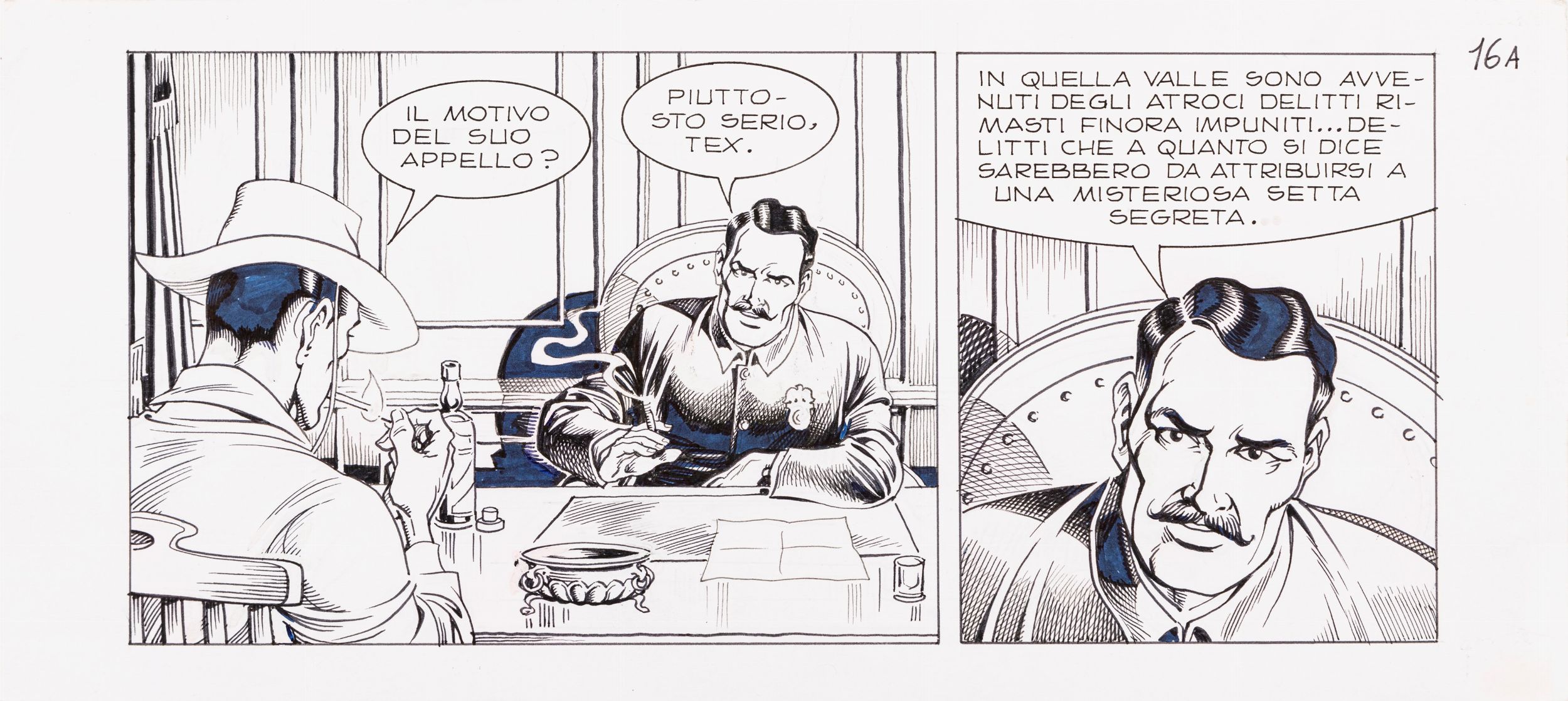 matita e china su cartoncino, 35 x 15,5 cm 1996 Striscia originale (16 A) realizzata da Magnus per il suo eterno capolavoro La valle del terrore, edita sul Texone n. 9 a pag. 16 dalla Bonelli nel 1996. Nel 1989 il maestro bolognese decise di rifugiarsi sull'Appennino Tosco Emiliano a Castel del Rio per dedicare tutto sè stesso alla realizzazione di un'opera monumentale: il suo Tex. Un lavoro lunghissimo ed estenuante per lo stesso autore, che spingerà Magnus ad un perfezionismo maniacale portandolo a ridisegnare più volte le stesse pagine alla ricerca di una perfezione impossibile da raggiungere per chiunque altro. Le tavole del Texone di Magnus non sono mai apparse sul mercato e fino ad oggi sono circolati semplici studi preparatori, Magnus decise di applicare sulla tavola definitiva una fotocopia di questa striscia poichè il pennino utilizzato aveva virato colore in alcuni punti del disegno apportando al contempo alcune modifiche, dandoci così la possibilità di poter custodire un pezzo di storia del fumetto mondiale. Lievi aloni rossastri causati dal viraggio della china utilizzata dall'autore.