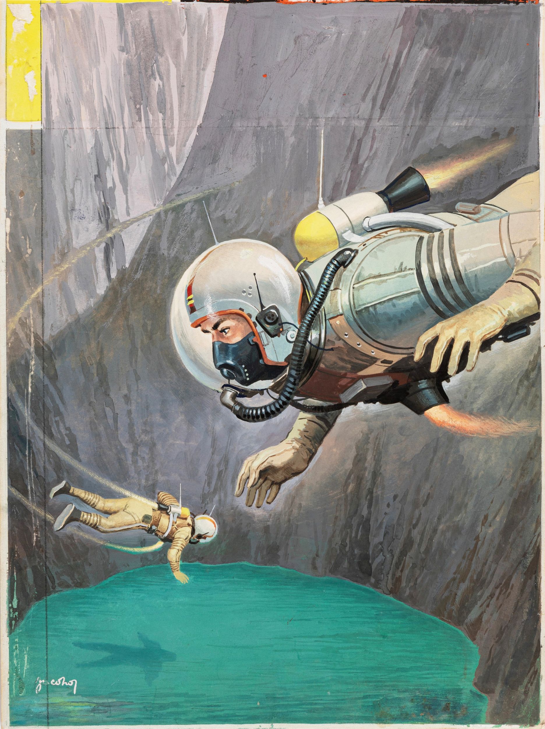 tempera su cartone, 25 x 33,5 cm 1958 Originale di copertina realizzato da Jacono per il romanzo Asteroide 588 Achille di Jean-Gaston Vandel edito nella celebre collana Urania n. 172 dalla Mondadori nel 1958. Un pezzo di storia della fantascienza dipinta. Firmato.