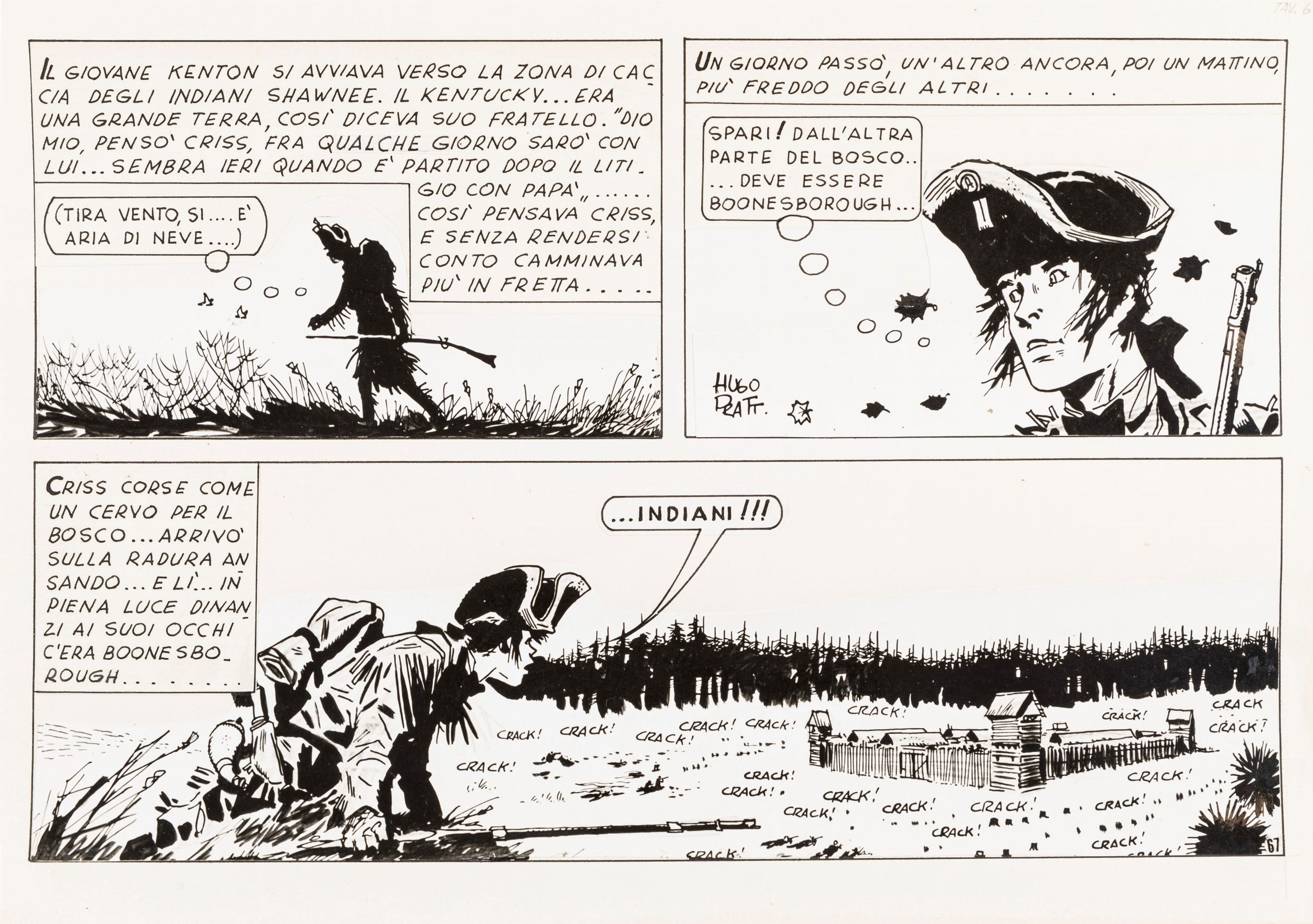 china e pellicola di stampa su cartoncino, 40 x 28 cm anni '70 Prova di stampa per la pag. 67 di Wheeling realizzata da Pratt nei primi anni ’70 per la prima pubblicazione italiana ad opera di Ivaldi nel 1972. Pratt decise inizialmente di mantenere un lettering in stile argentino (all’interno di balloon squadrati), successivamente modificato per la versione definitiva.