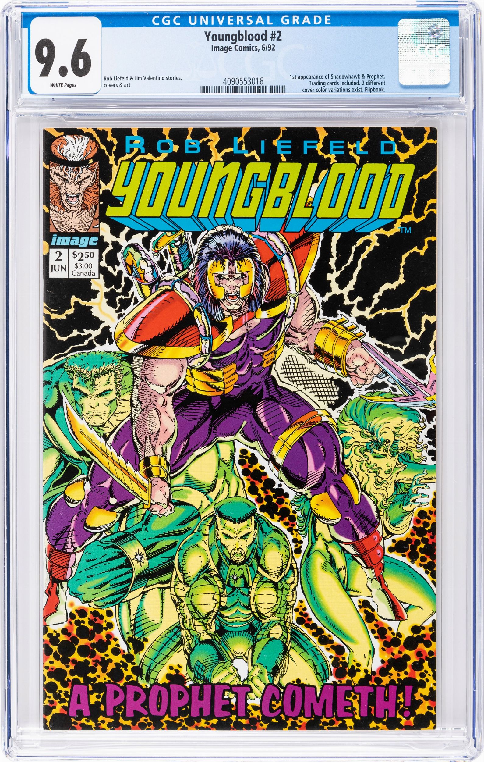 Page Quality: WHITE, Grade: 9.6 1992 Comic book certificato dalla CGC con un grading 9.6 (CGC Cert # 4090553016), case sigillato e in ottime condizioni. CGC Comments: 1st appearance of Shadowhawk & Prophet. Trading cards included. 2 different cover color variations exist. Flipbook.